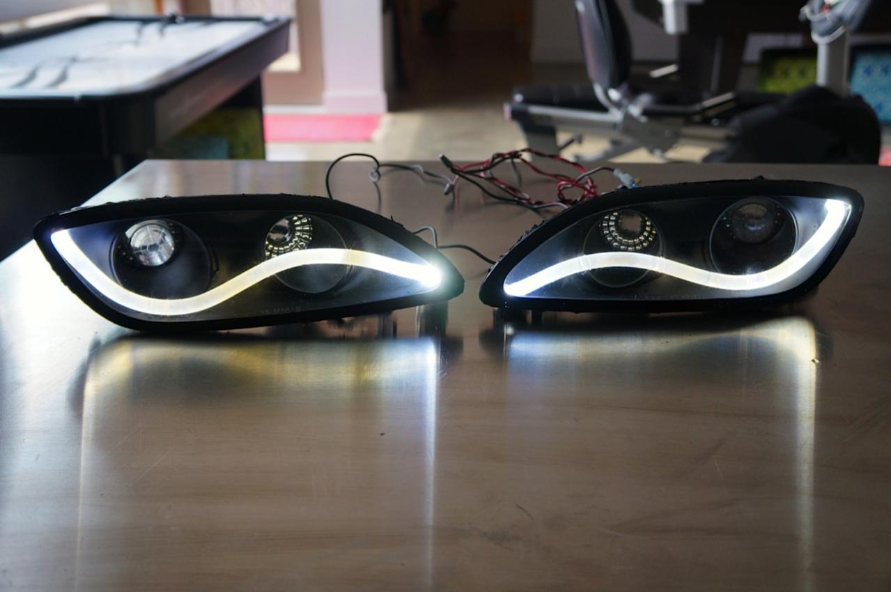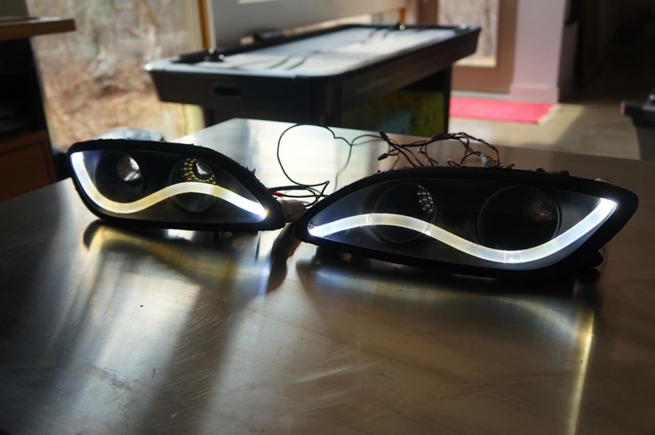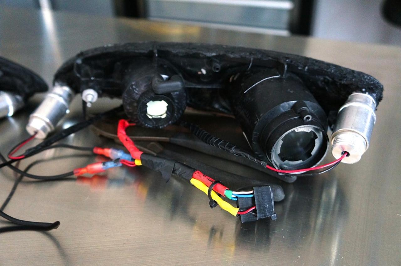 I'm still going to use the two stock lights, the one for the parking lights and the other for the turn signals. Of course, these are LED on mine as well. Trying to figure out how to add a relay into the sequence so when you turn on the turn signals, the fiber optic rod lights go out on that side of the car. One thing at a time. I've test fitted these and they look pretty cool and I'd show some shots installed, but the car is not here so I can't.