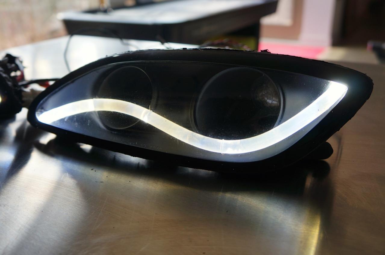 I accomplished this by testing a bunch of acrylic and plastic rod materials, ultimately settling on the fiber optic rod for its superior light emitting capabilities. I then made a pattern for the fiber optic rods and used my heat gun to form the rods to the pattern. I built LED light emitters, with one for each end of the rod, or two per turn signal and then wired them up to two "Buck Puck" LED drivers. Installed all of this into the housings which I converted over from shiny black and chrome to matte black aka Herblenny's turn signals.