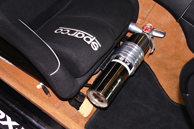 Interior wise, ripped out the stock tan carpet and installed black. Took me all week to do this so you don't want me doing your carpet install but it sure looks nice now that it is done. Sparco sponsored me with a set of black EVO full bucket race seats and with modifications to them on the side bolsters and some rail adjustments to the Bride rails, they now fit nicely and allow me to sit comfortably with a helmet. Even modified my SakeBomb "replica" fire extinguisher passenger seat mount to fit with the Sparco seats so that looks nice as well. Di some rewiring while I had the dash out as the aftermarket stuff was crap and brought in a stereo expert to rewire my audio equipment as that was not good as well. Had the headliner replaced with with black Alcantara, redid the gauges in Black Cat white faces, and installed a full suite of Redline Goods leather pieces, including a pretty trick steering wheel wrap. Finally, had the door sills re-clear coats as well so they now look like new. Have some shots of some of this earlier in the thread but will take some nicer ones once I get the car back and cleaned up. All in all, pretty set now on the interior.