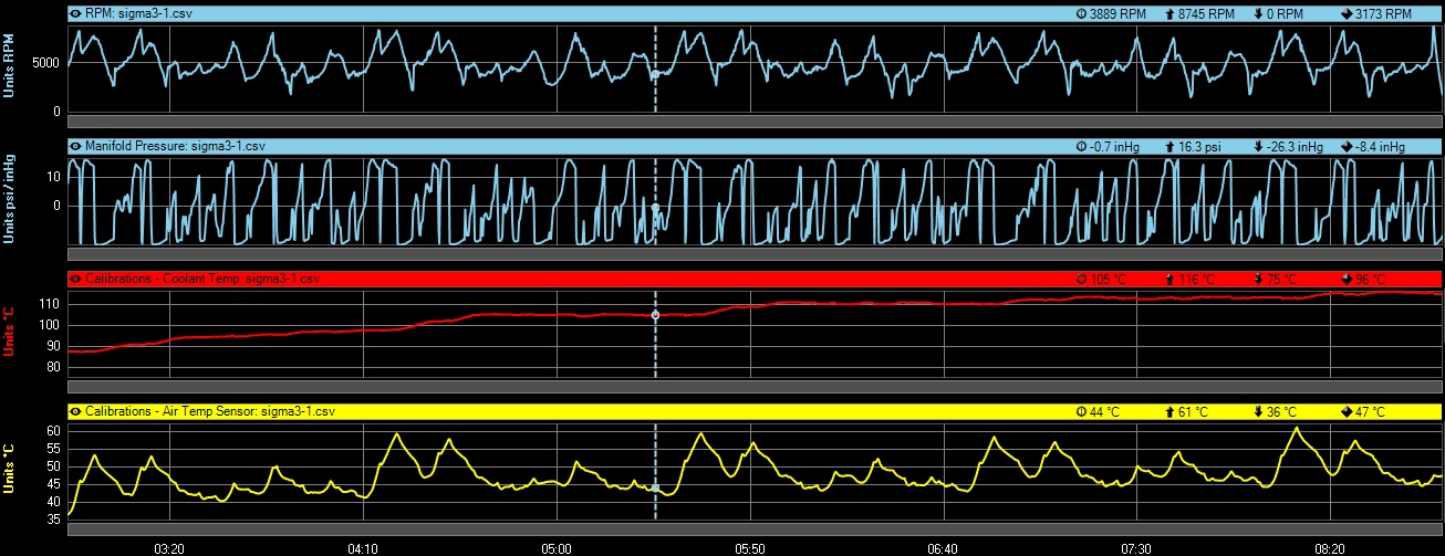 Here is a datalog of a session at Shannonville with about 4 laps worth of data... If I remember right, it was actually a cool day that day.