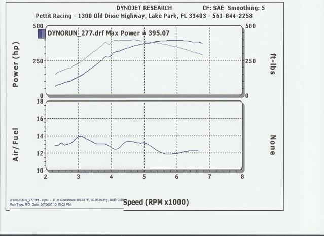 Somewhere around the time Pettit was working on my car, they changed their claim from 550 to 500 HP. I've attached the only "dyno" chart I've ever seen - it's an Excel spreadsheet graph. Also included is my dyno sheet - could never get more than this regardless of what I tried.