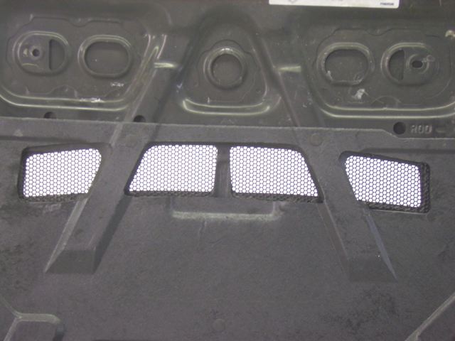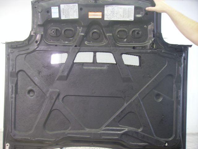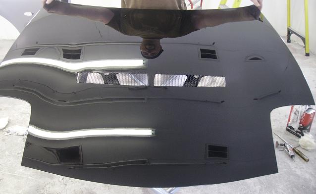 The mesh material is aluminum and powder coated flat black to give it an OEM feel. You've also asked what the underside of the hood looks like. I've kept the insulation material and Asian Motorsports (body shop/painters working with Gotham Racing) inset the mesh under the insulation and cut holes for the vents: