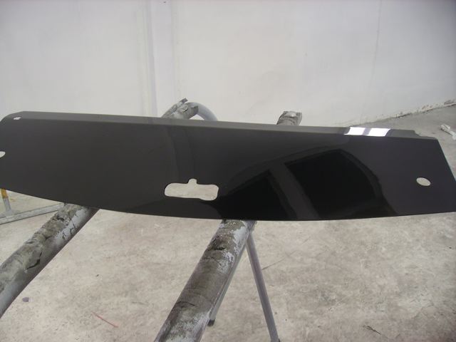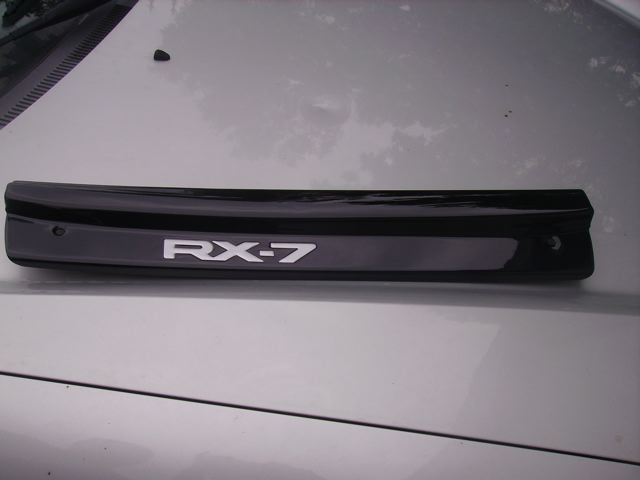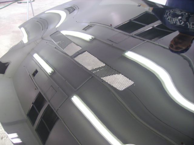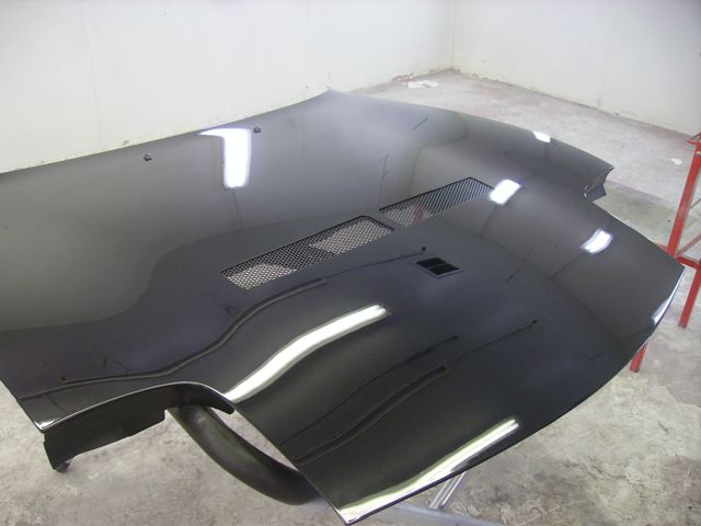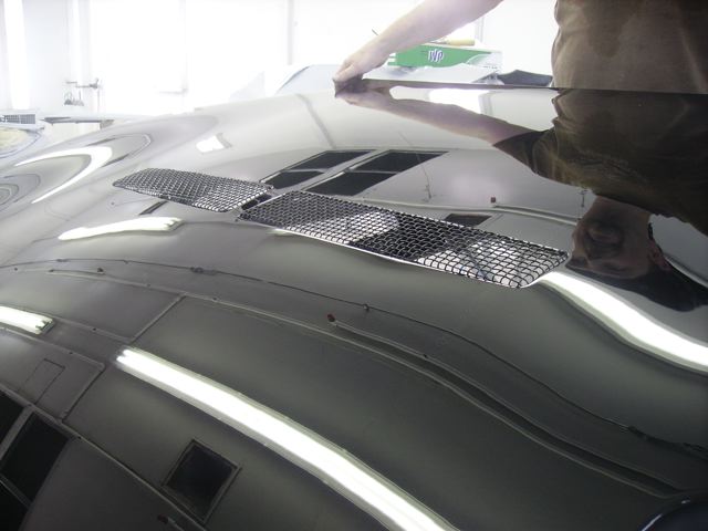 While the car is there, Gotham is working on a few small things. They're replacing the PIAA fog light switch I have with an RX7 OEM one and a few other things like this. The painter is working on painting my radiator shroud with the same black finish as the car and they're also doing the same to my door sills. Speaking of painting, the hood vents have now been completed and the hood is painted. The vent mesh material has been shaped: