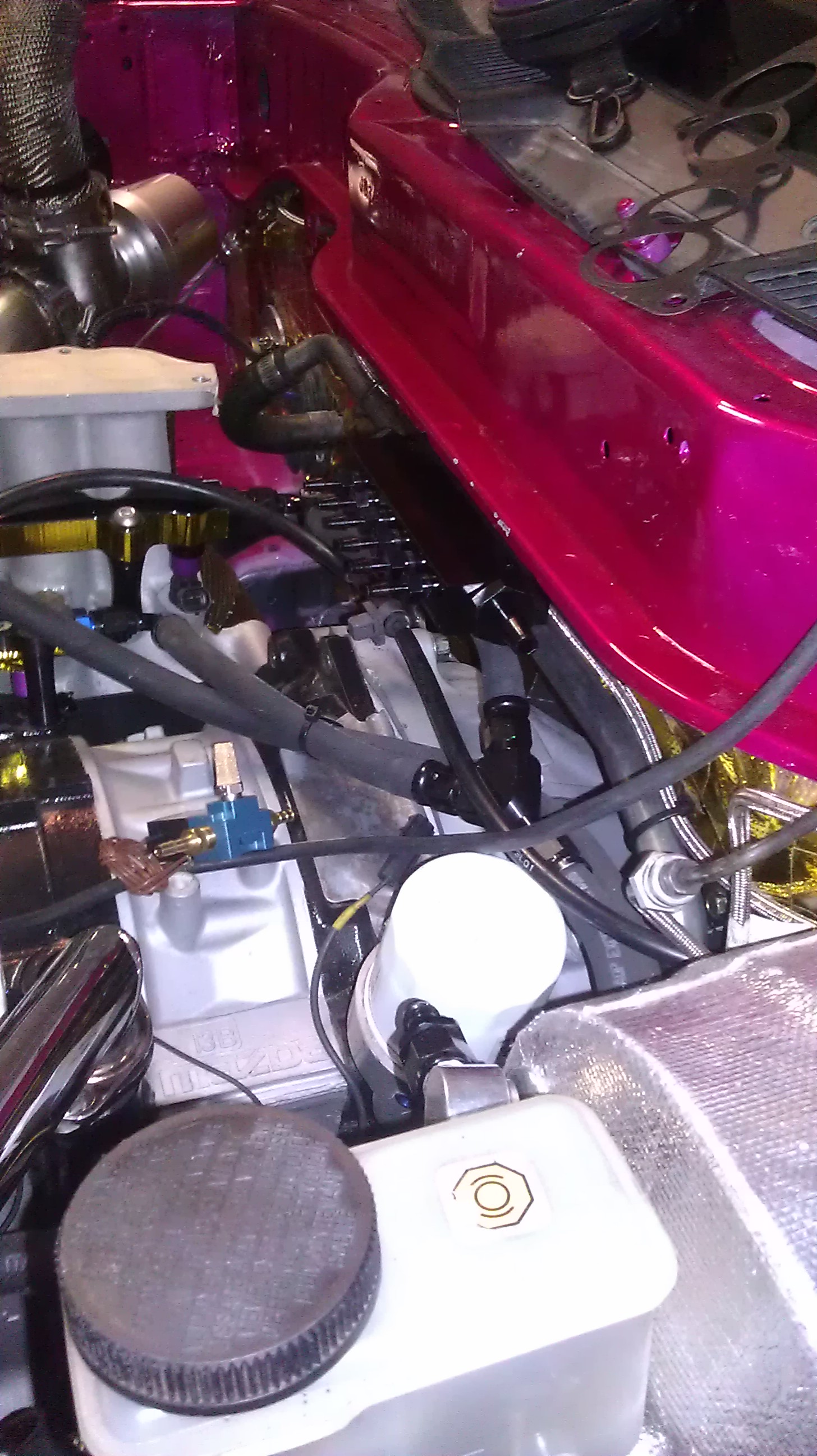 And lastly...I noticed a small little puddle of fluid under the car and had no idea where it was coming from until I followed it all the way up the drivers side trans tunnel and found the source...Brake fluid. Seems as if the new hose I put on the clutch pedal side of the brake resevoir wasn't tight enough with the generic clamp. I should've put a worm clamp on it from the beginning..so I did and fixed that. I guess it's a good thing it's taking a little bit to get the car finished because it gives the car and all my mistakes time to surface hah.