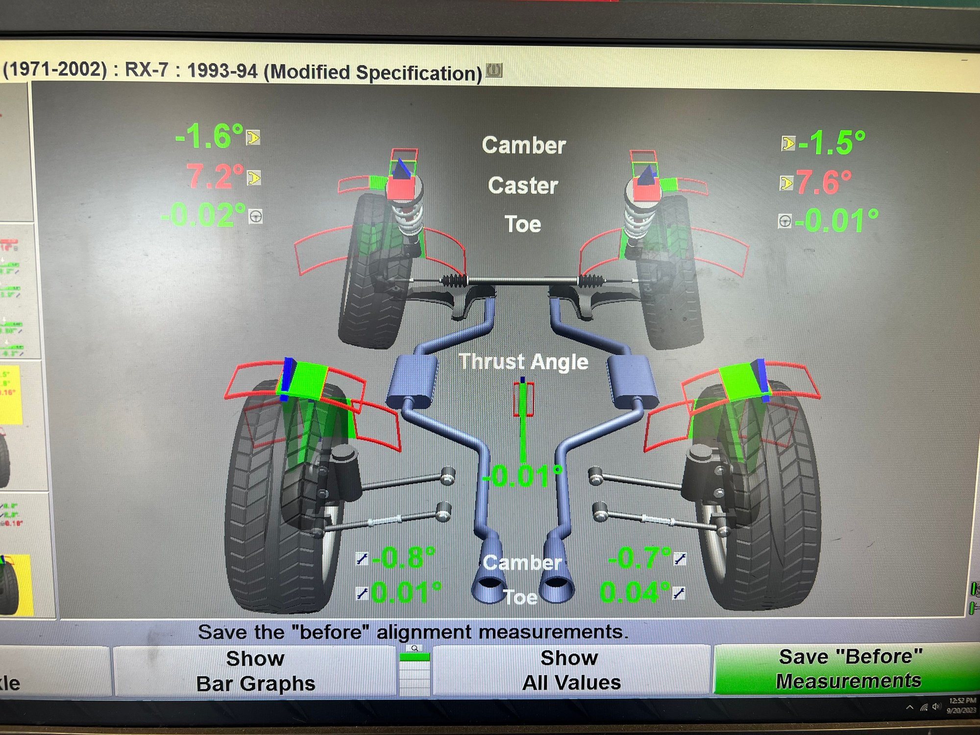 Before with an eyeball alignment. Front toe went into spec as soon as I got the rear in. Casters a little far forward but I’m happy with it.