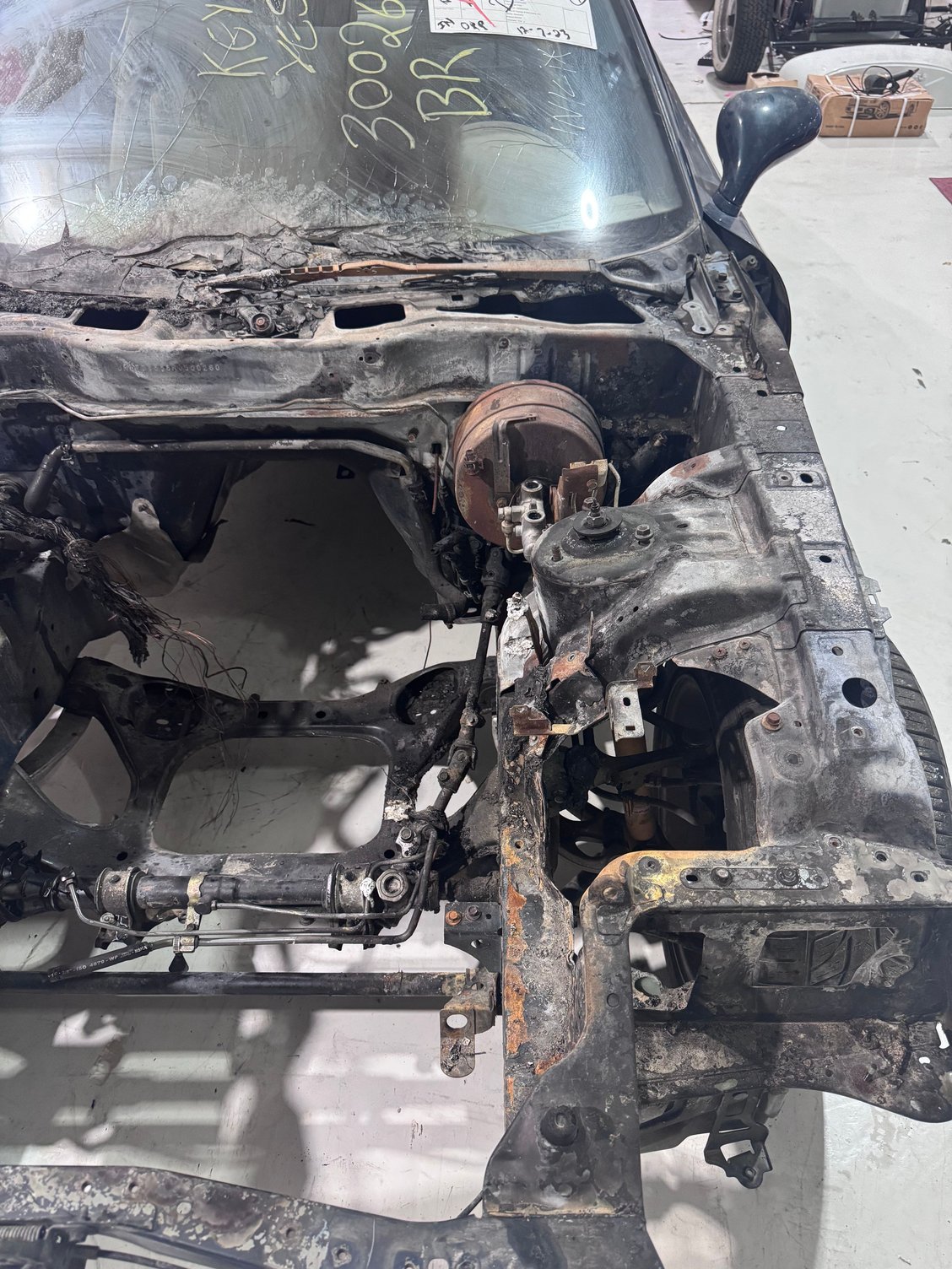 Here are some photos of the project so far. I pulled the engine out and started stripping the bay. As you can see, most of the parts were melted from the heat of the fire, so there’s a lot of work ahead.