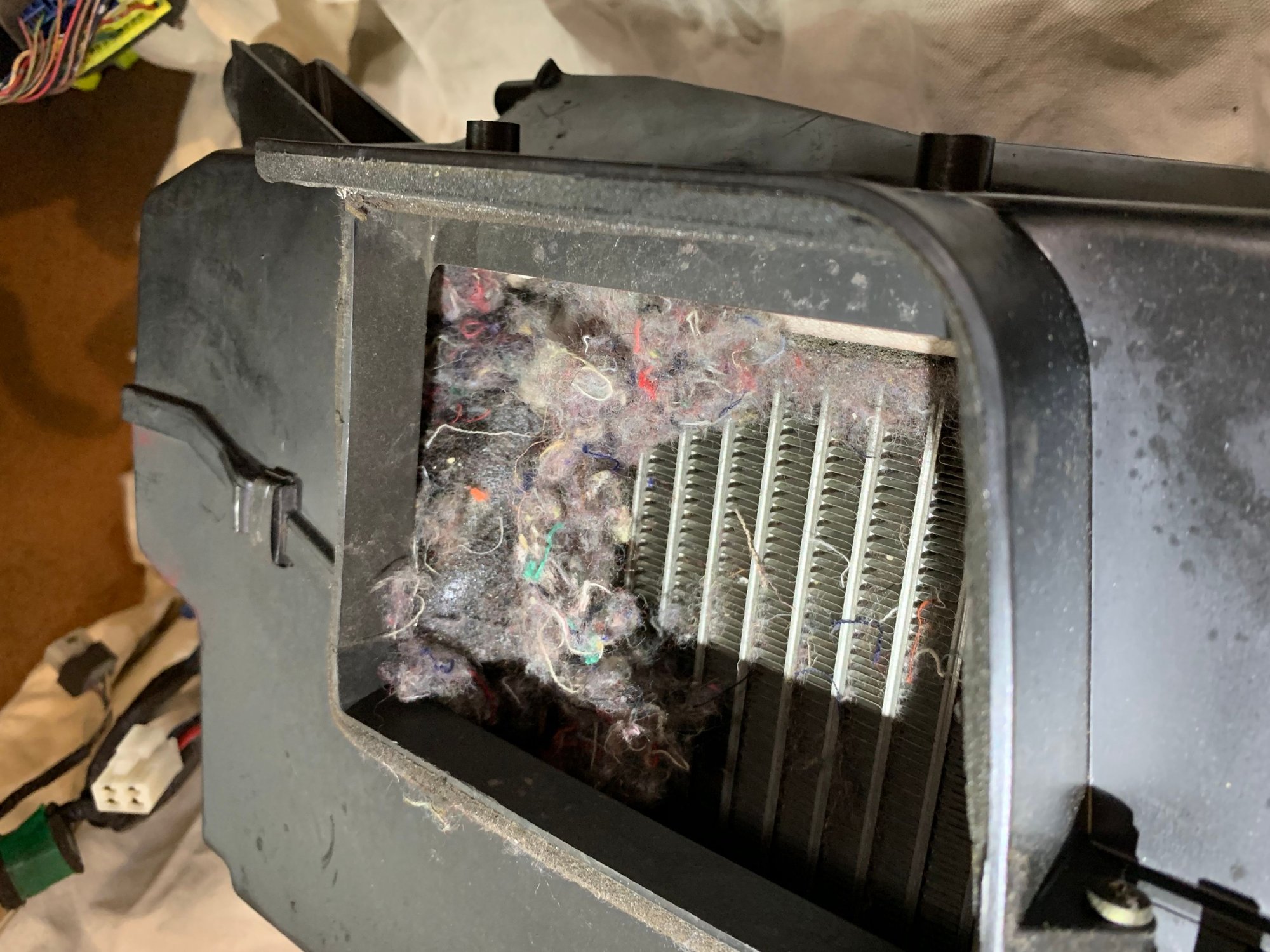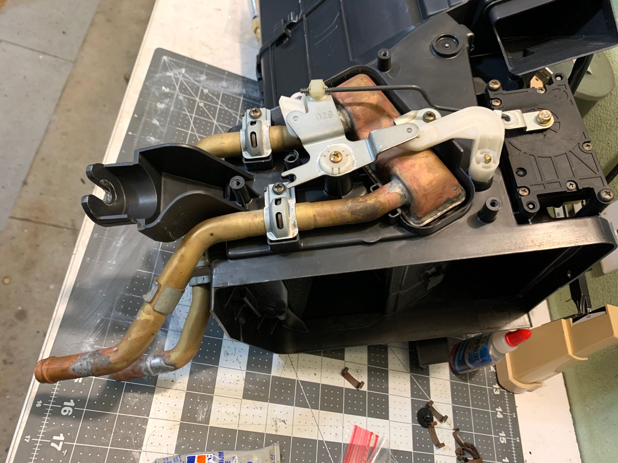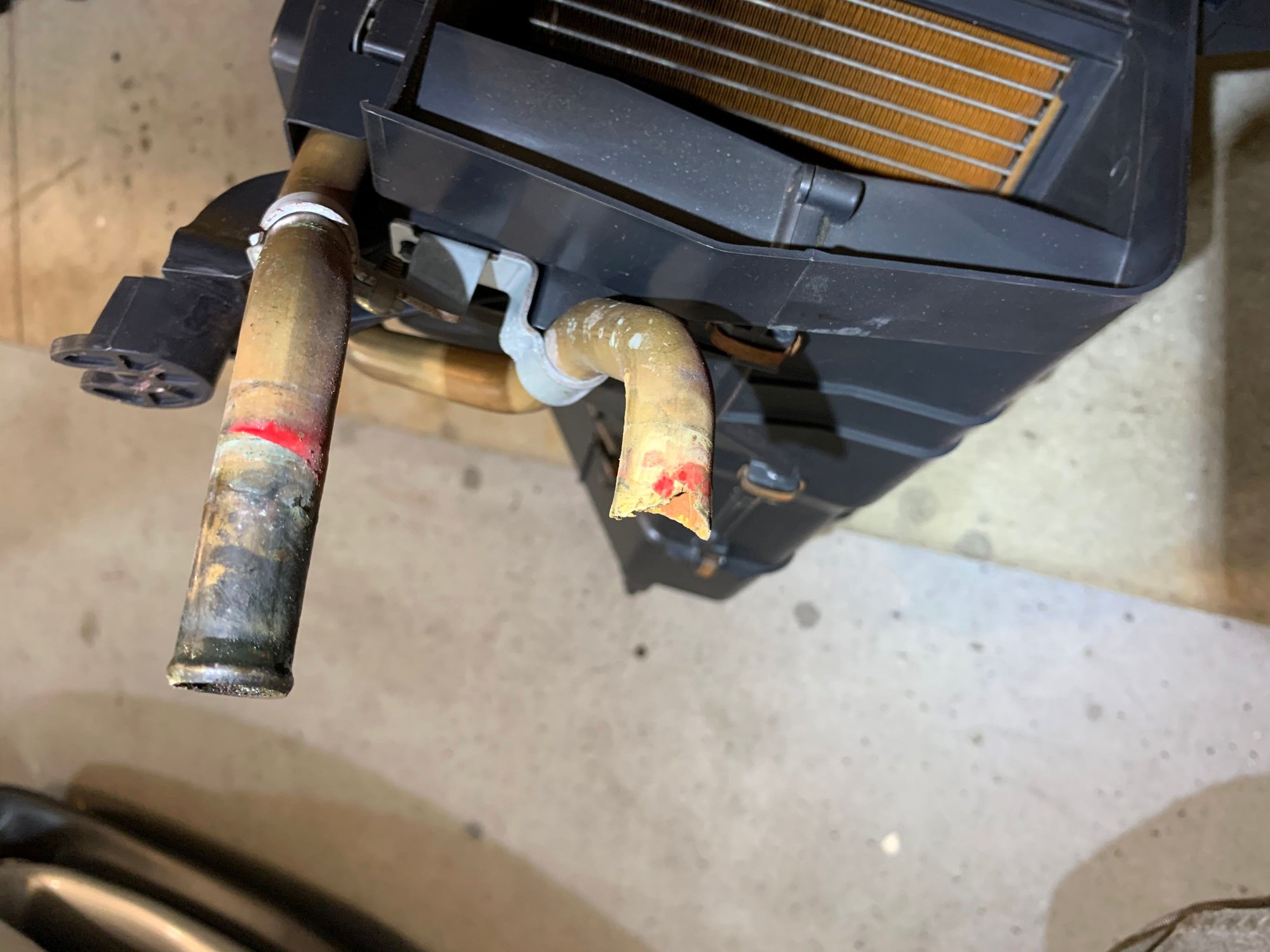 One of the first things noticed was a crack in the heater core lines. To get to the core, the dash needed to come out. Sadly, Andrew had to destroy a nice mouse home during the process. Everything was cleaned and reassembled.