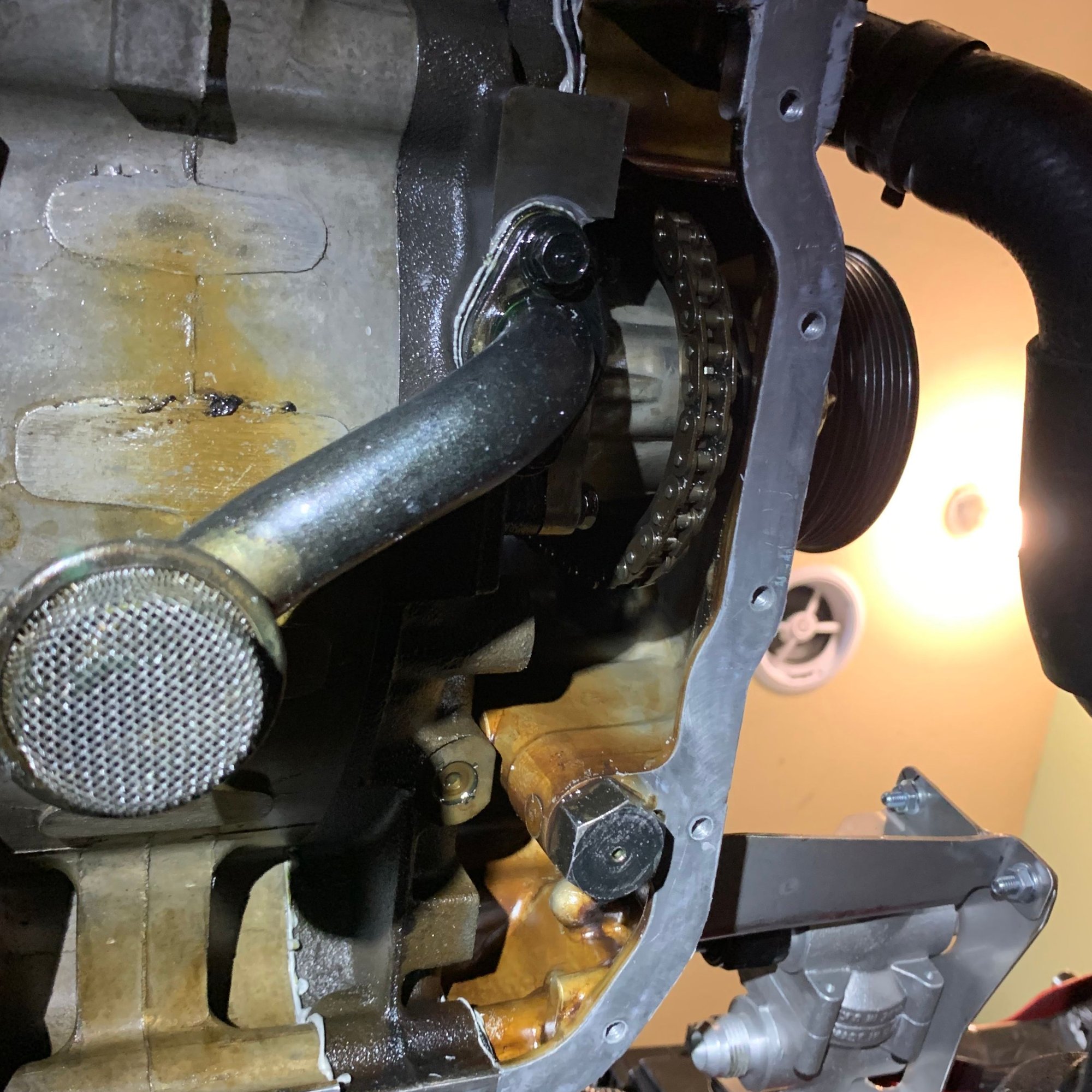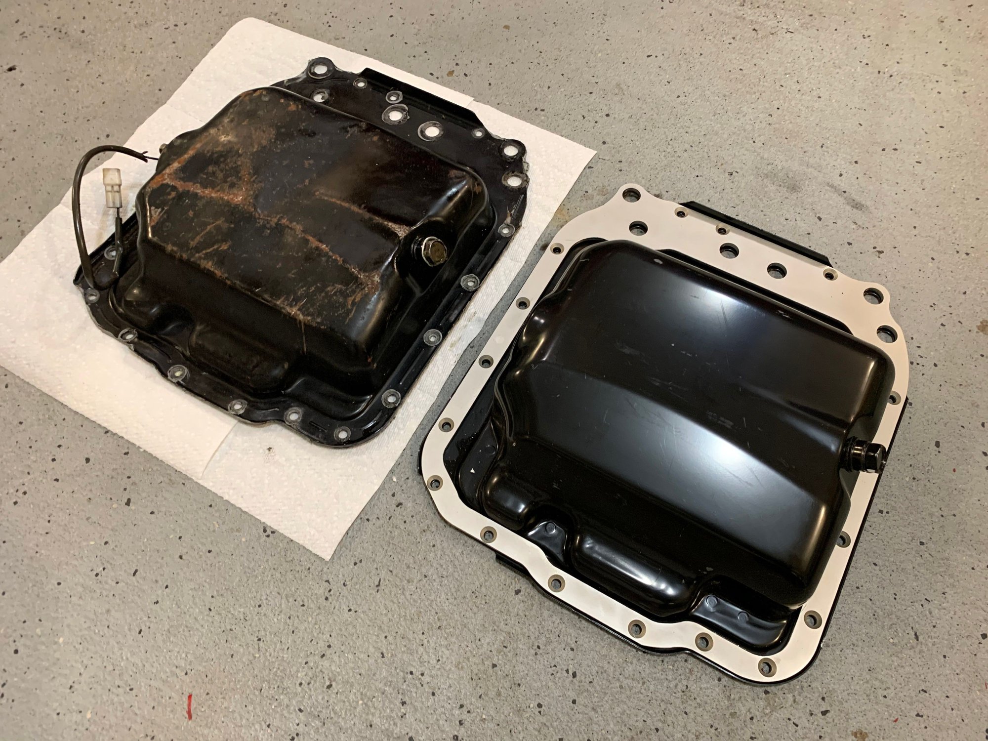 This also was a good time to take care of the oil pan and brace. The original pan was beat up pretty bad from running so low. Replaced with an OEM new one and Chips Motorsports brace.