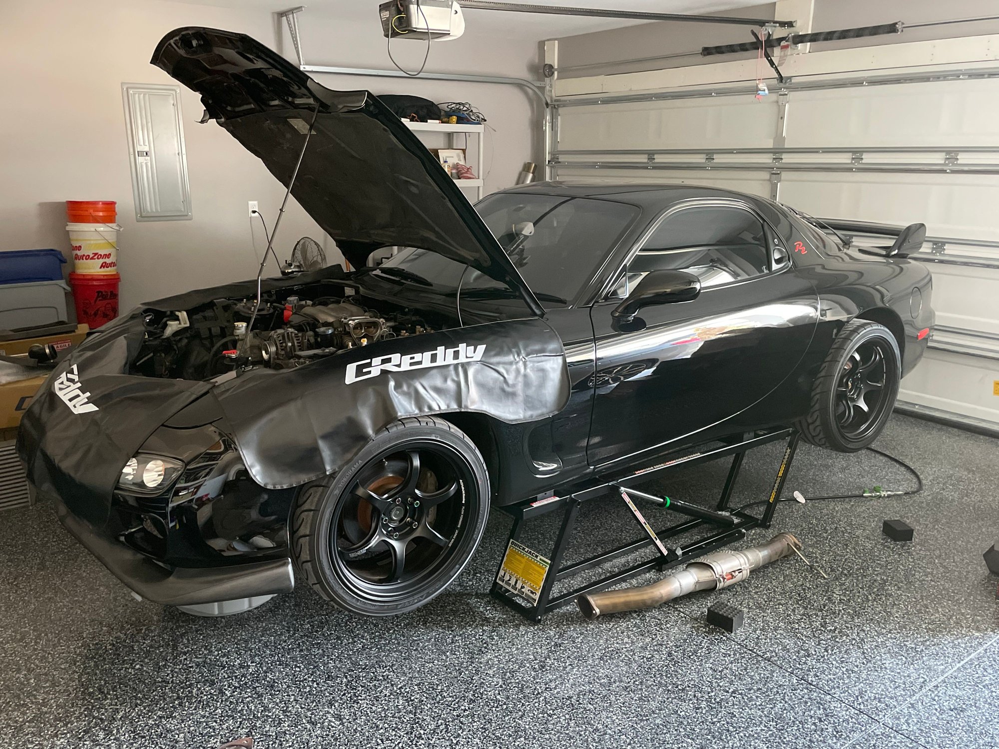 The RX-7 is running, coolant is burped, the ATX30HD battery is installed with the Z-Precision battery tray in the driver bin. LED Lights from RX-Lights are in.