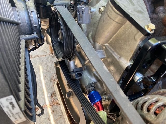 I temporarily installed the side mount alternator bracket (shout out to Franklin Motorsports for their support) and noticed that the factory V-Belt makes contact with the crank angle sensor. It is close to the oil cooler line but does not touch. I'm open to any ideas or suggestions.