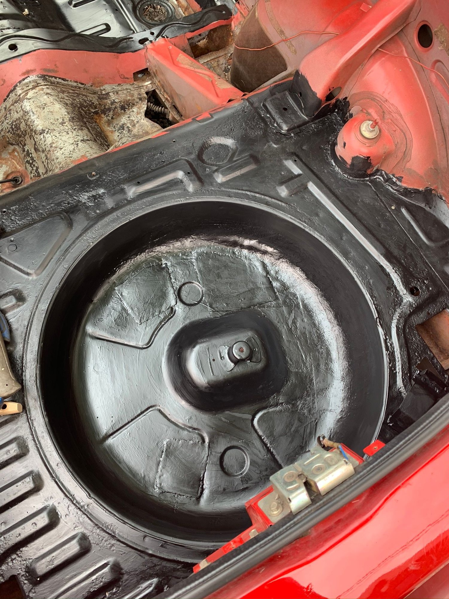 All tar stripped, rust repaired and resprayed w/ Eastwood rubberized undercoating
