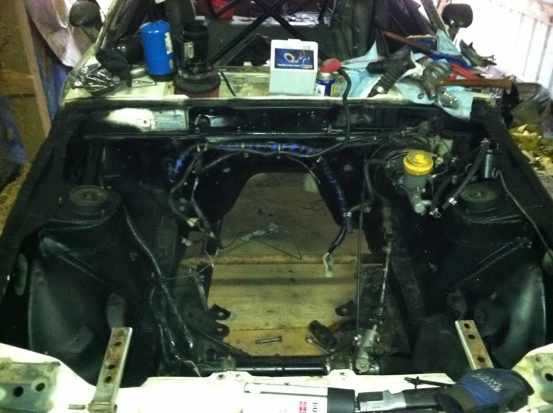 yanked the motor for the hopefully last time. did some cleaning up, welded up my strut tops and painted the engine bay.