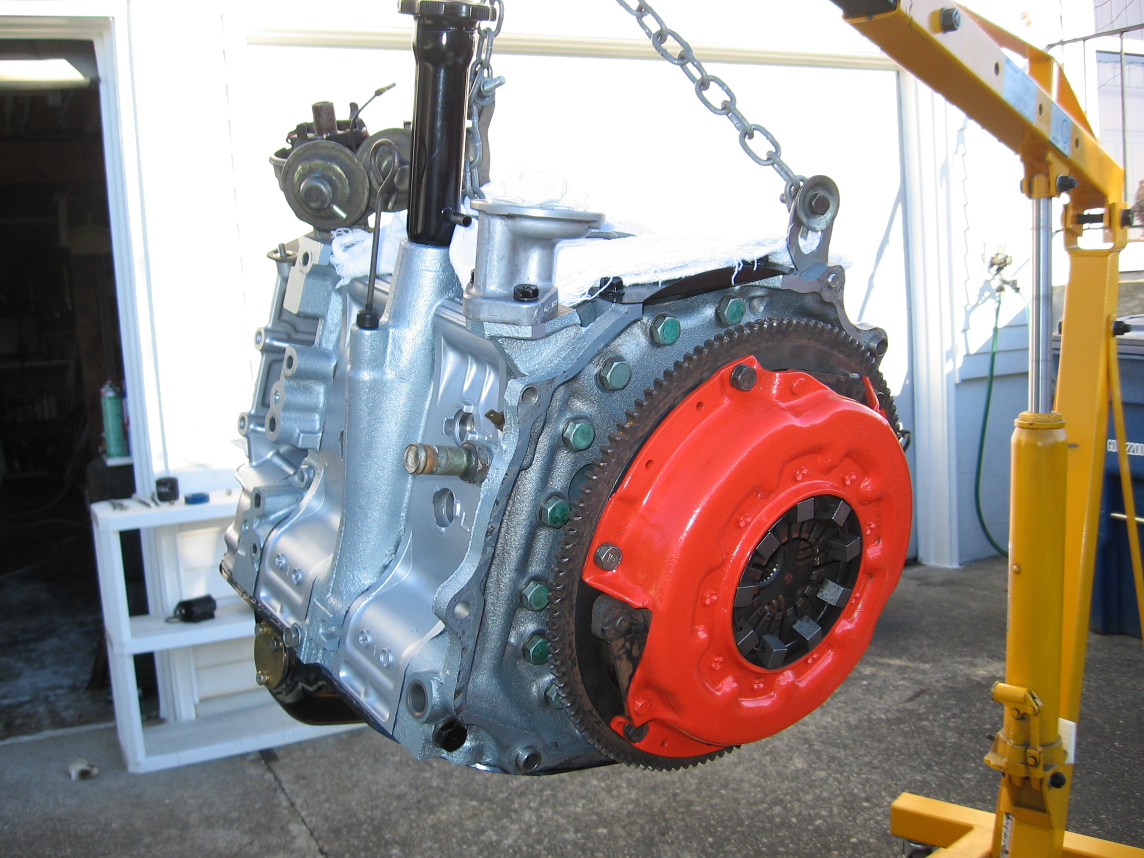 The orange pressure plate is a centerforce. The old paint was about 90% flaked off so I did a quick mask job and and hit it with about 1 1/2 coats of fresh orange engine paint. This p-plate+disc+flywheel combo had more than enough grip to hold under boost when it broke them loose for the first time in 3rd gear in the brown car back in December last year, so I figured it'll work here too. It was only 40 degrees F outside and everyone knows turbos make more power the colder it is.