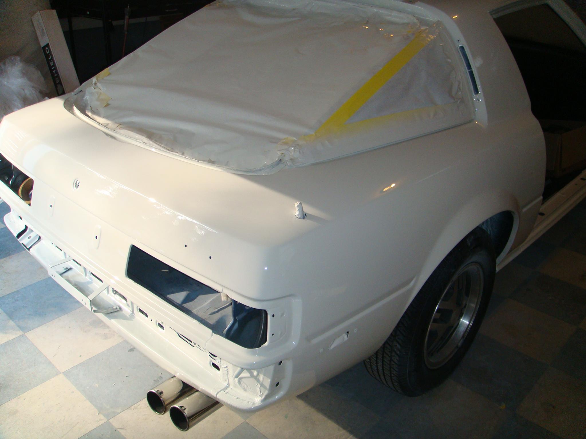 So we finished all the prep work, and as a last minute chang-up we decided white was a better color. Yesterday we painted the whole back end (unibody), and here are the pics. We were going to do it in a paint shop but we got **** on by management lol, however so far its comin it pretty damn good, except for a few runs which will be removed when we wet sand the body.