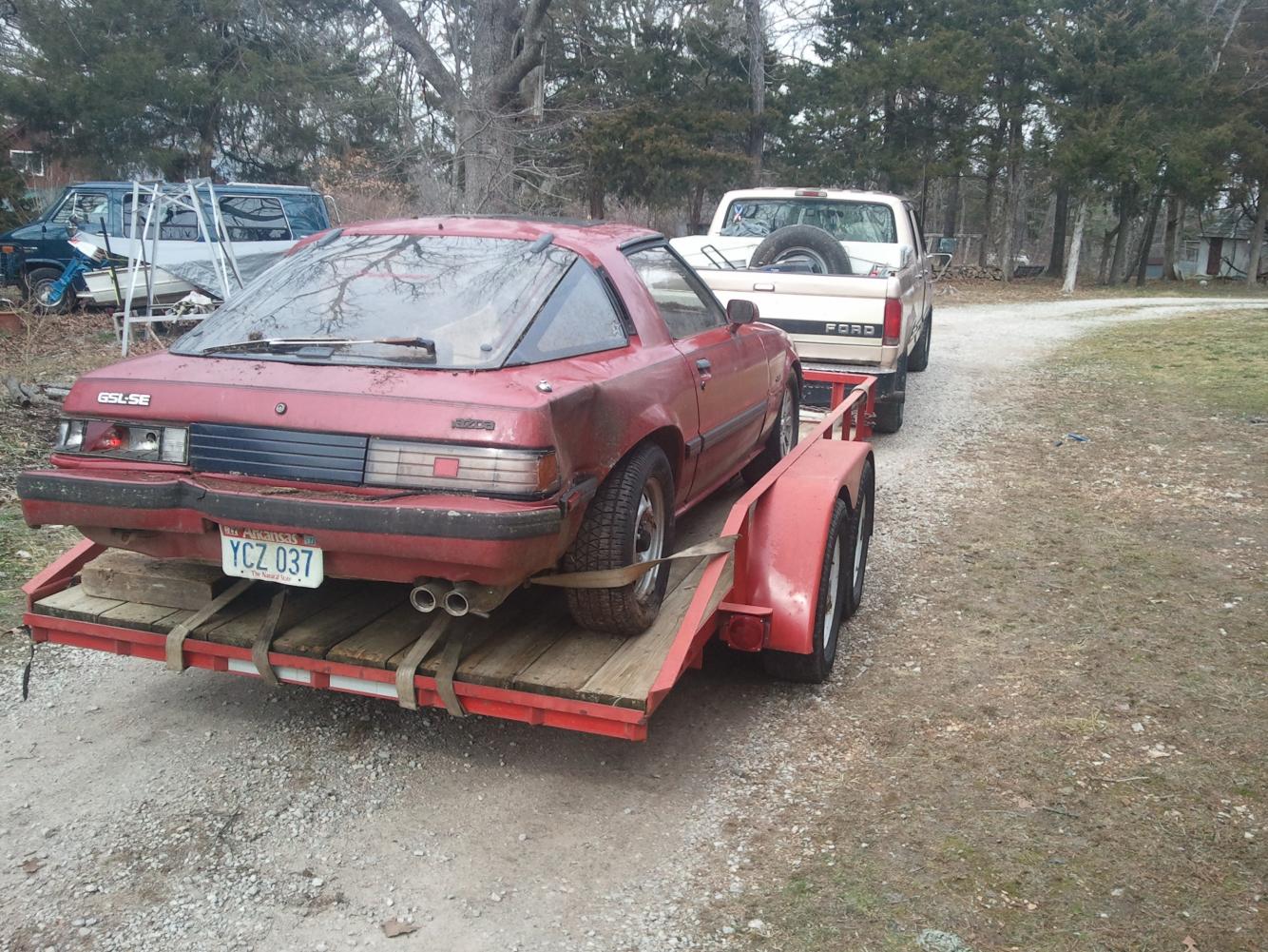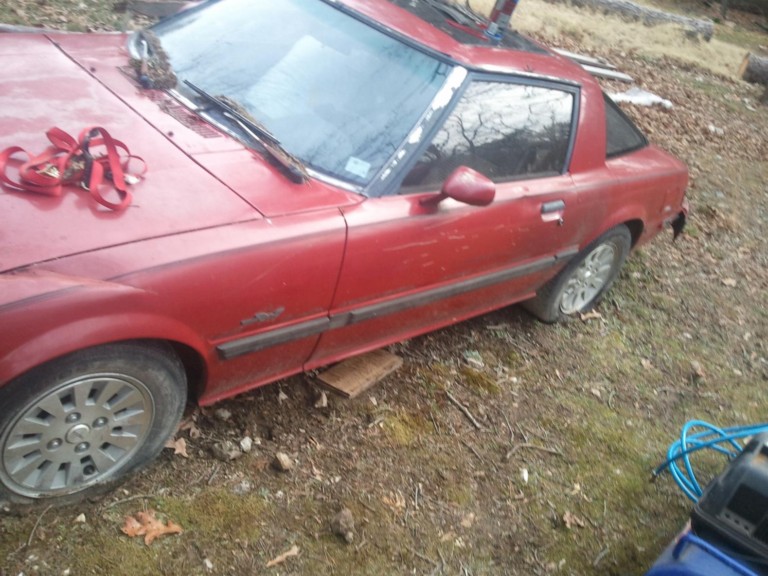I came to the conclusion that it was definitely 13b time. This 85 gslse was on top of a bluff in the middle of bfe arkansas. Left out in the elements the body had seen better days. All four tires would only hold air for about 60 seconds. The critters also didnt do this old car any good. A good deal of the engine wiring had been eaten and or chewed. The interior was almost perfect except for the hundreds of spiders under the carpet. 350 dollars and 6 hours of travel and moving thr car it was finally home. I would have just drove the car but it didnt have a title. So I had just got a complete parts car.