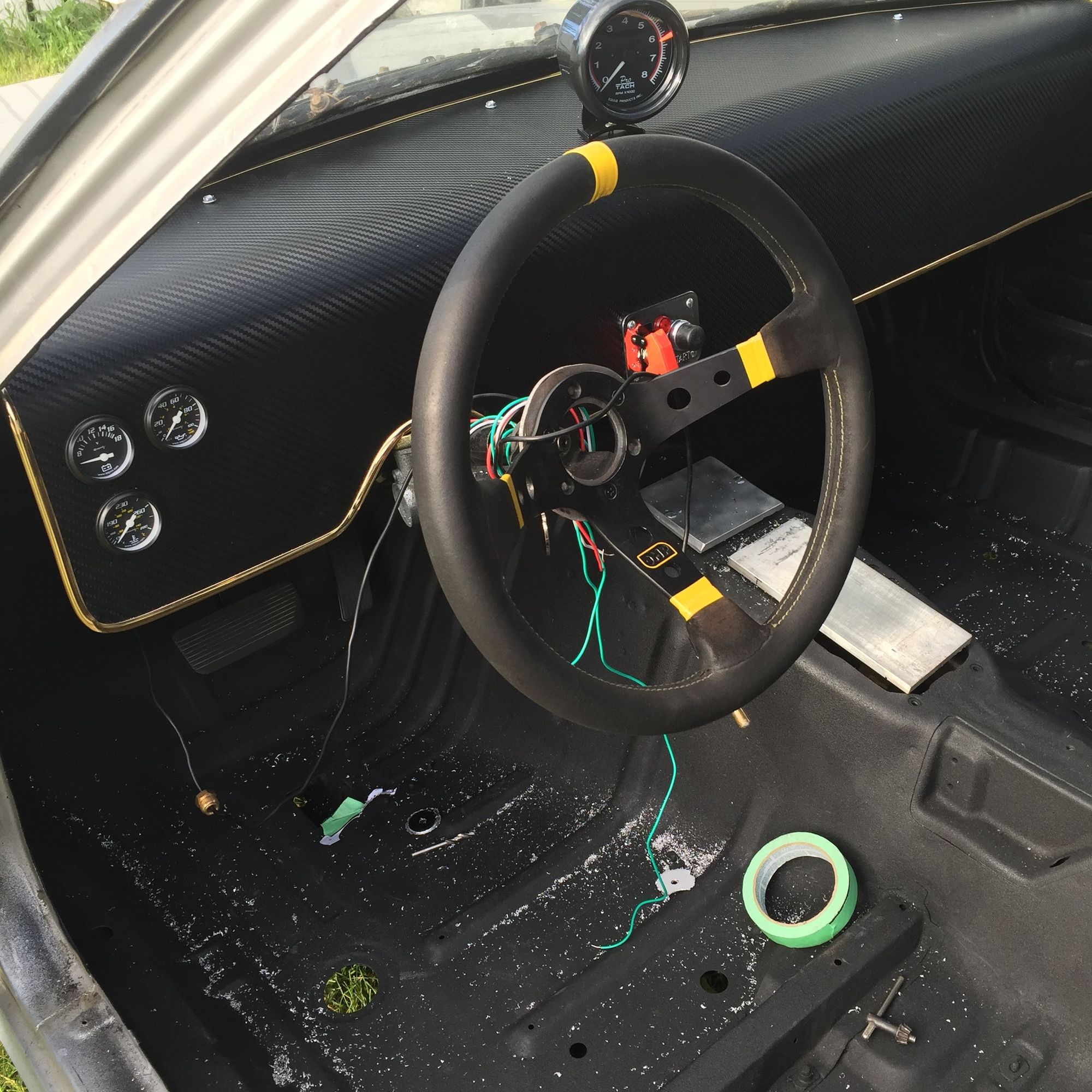 I found a peice of scrap metal at my dads work and it was 6 ft long and already was bent at a 90.so I measured and started jigsawing.at first I painted it alluminum color but wasn't happy with the finished product.so I was in Canadian tire and seen a roll of 3m carbon fibre wrap and gold trim witch cost me $60.the gauges are Equis and cost me 120 and the ignition switch button panel cost 30 bucks on sale at princess auto.all together it cost me 220 so far for the dash work