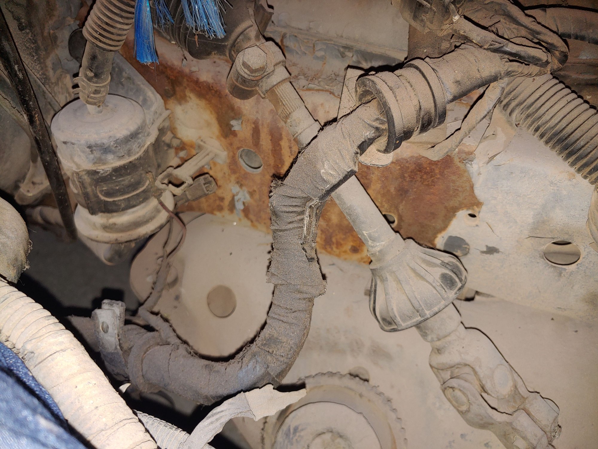 So here's todays dig in. Found one more wire that was cut (or maybe it broke off? It doesn't particularly look cut clean) that was near the right side headlight, the sensor from the previous pic was absolutely trashed, the alternator wire has the crang angle sensor connector still there, as this seems to be a completely different wire going towards the tranny.