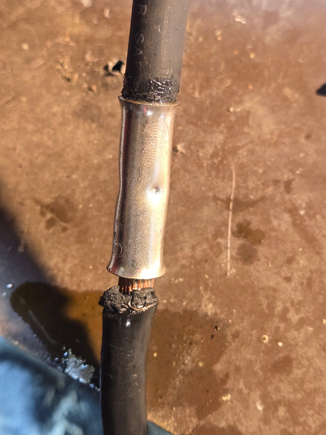 For such an important connection, I would've bought a 50-80 dollar hydraulic lug crimper tool from Amazon and picked up the appropriate size crimps. This would ensure the wires are tightly and correctly joined together. After soldering most of my last engine harness, I finally took the drive and got the correct wiring crimping tools. Gave me a lot more peace of mind being able to replicate factory termination/splicing methods.