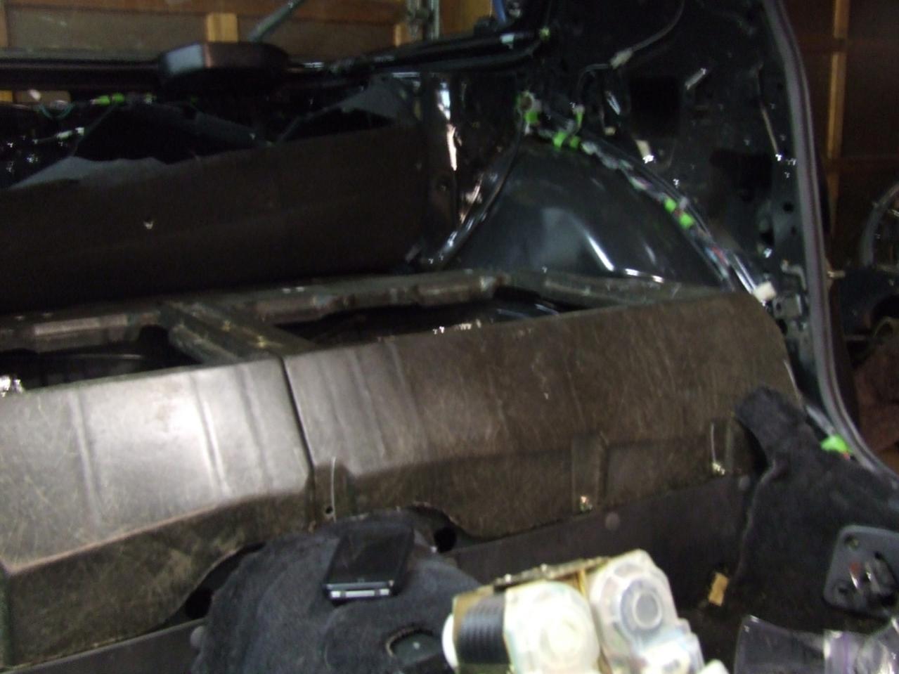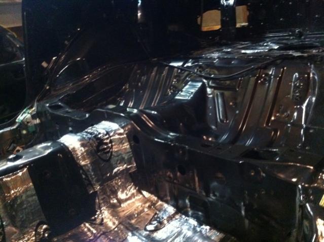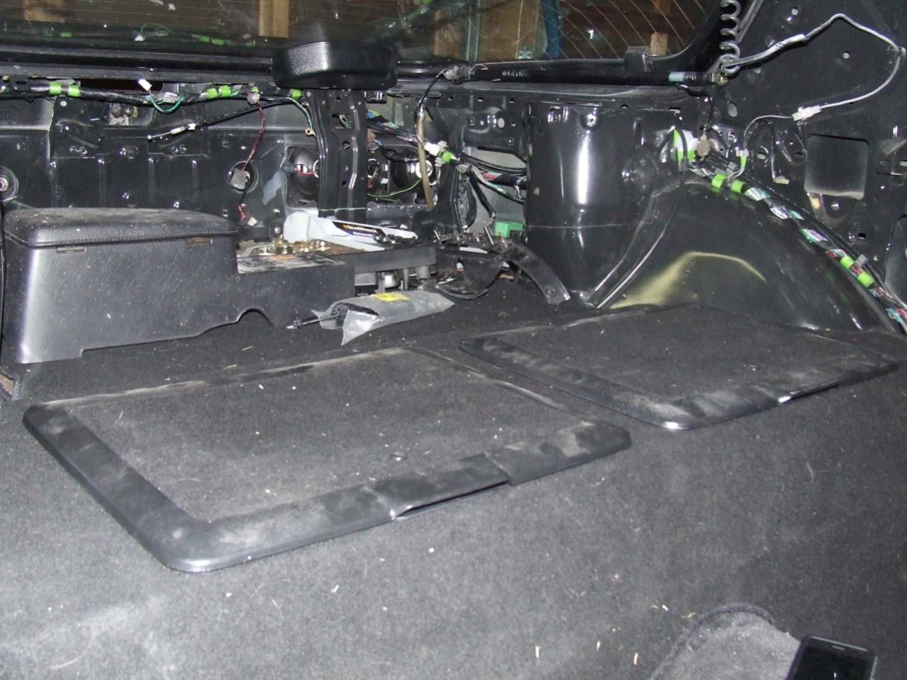 Since I got it, the sum of what I've done is: cleaned 95% of the floor boards, installed all the Dynamat except in the storage bins, installed the rear hard bumper mounts, set both hard bumpers in place [no idea where the bolts are yet..], put the pass. side wiring harness in place, and found the particle board wire guards.