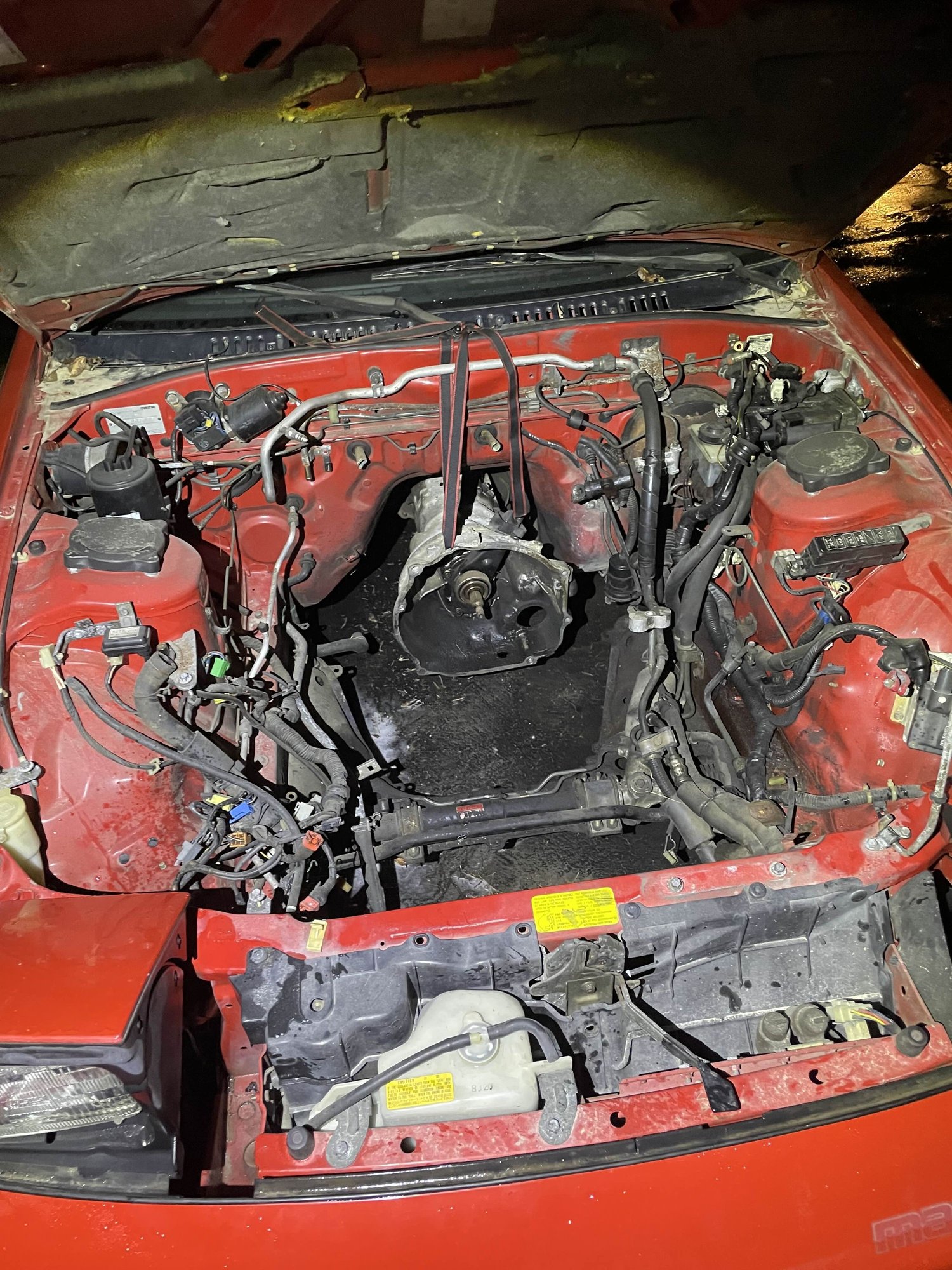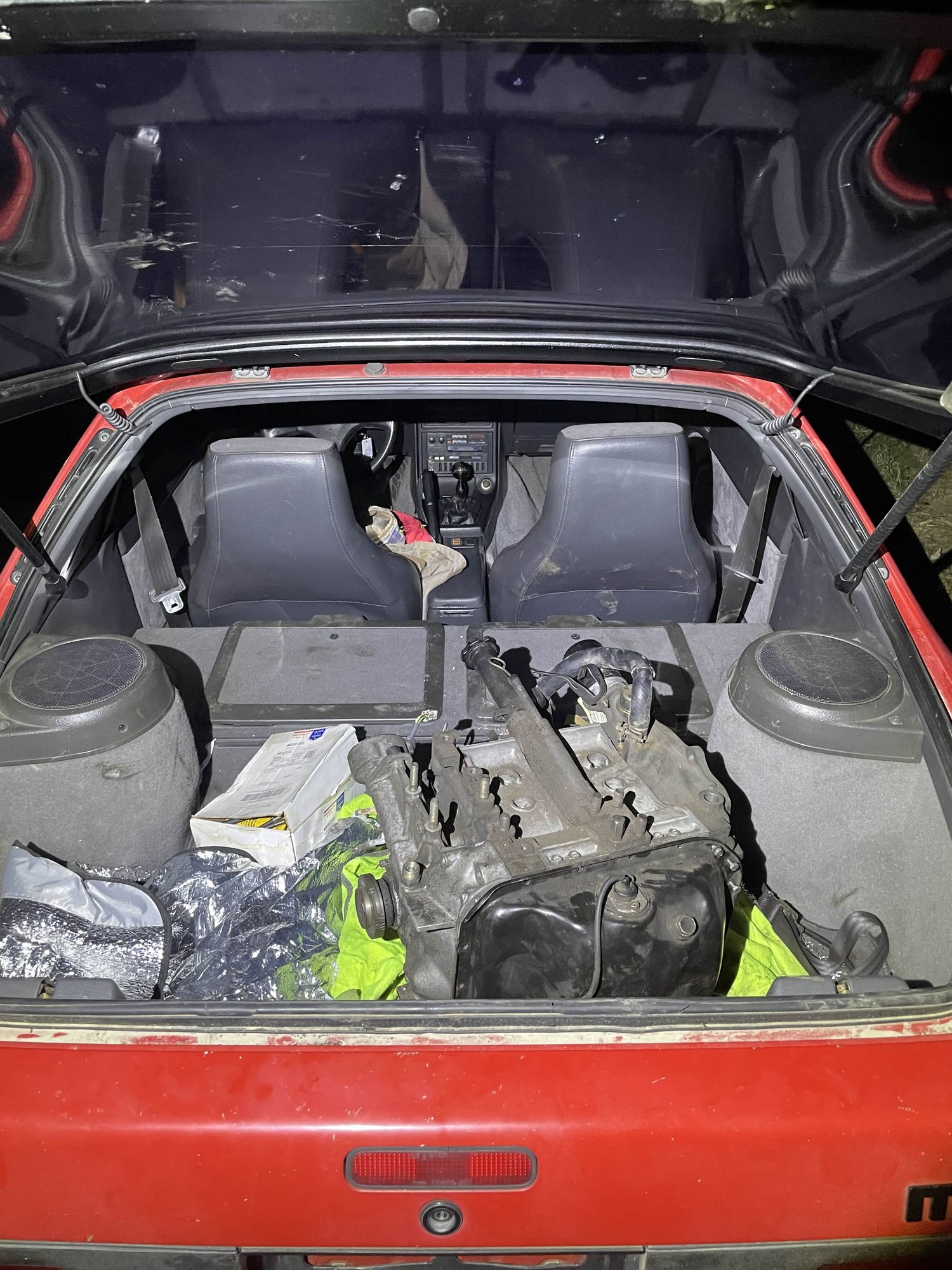We ended up getting an s5 engine (1991), and we rebuilt one engine with Matthew Orth with the Rotary Engine Workshop. He's a super awesome guy, if you need to learn how to rebuild a rotary then definitely go to him. The only part we used from the original engine was the front iron. as the s5 engine's front iron had had a critical failure. The front rotor/housing/iron were all ok. All of the rest of the parts of the rebuilt engine are s5 parts. We turned the eccentric shaft and it sounds 100 percent. We ended up going with a big streetport, and we ported the housing too in hoped of getting the most brap. We painted the engine too, I will add some red accent.