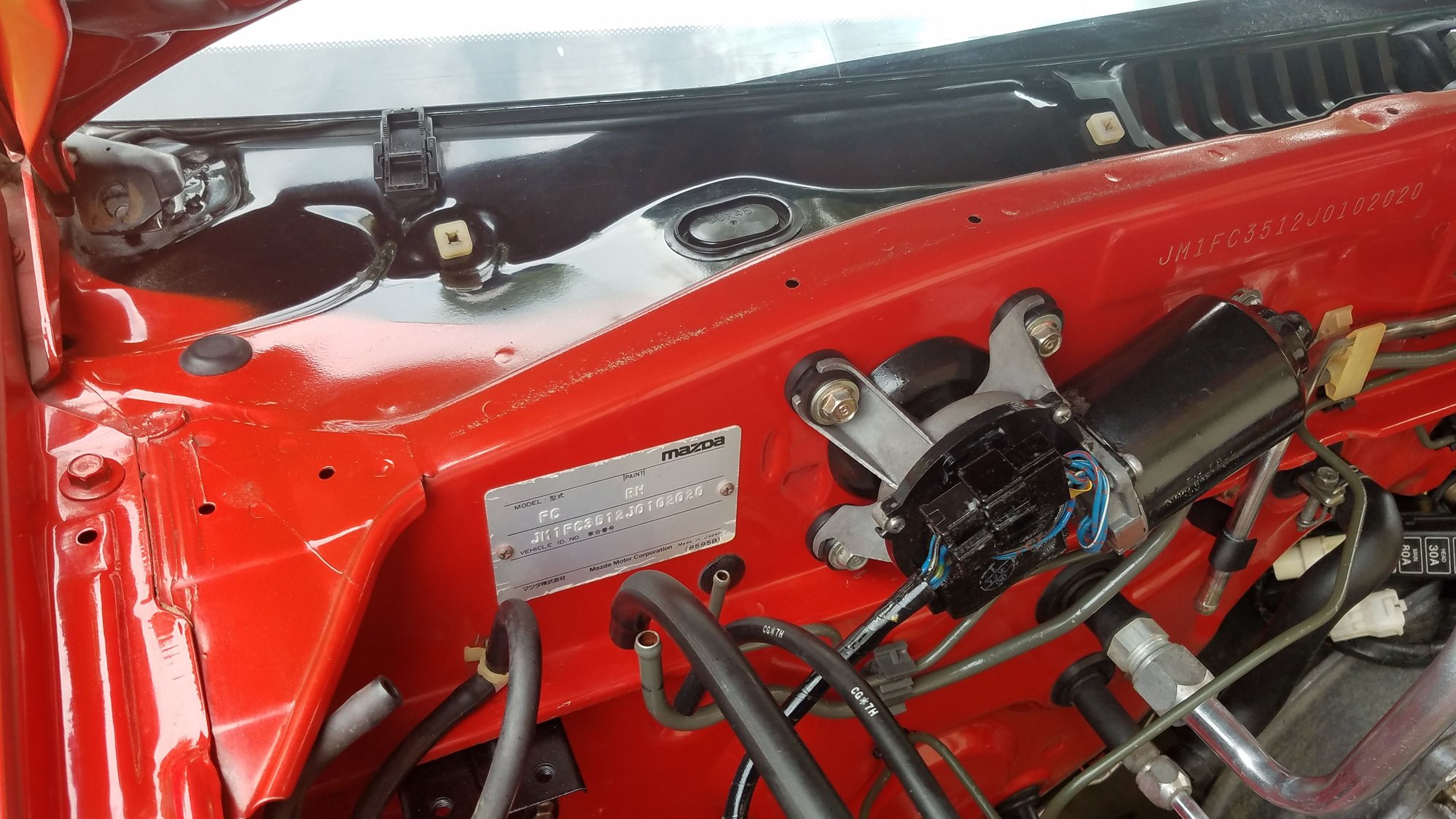 The good: the car was complete - everything: manuals, all the accessories that come with a convertible and the seller even had the original window sticker. All the electricals worked.. The seller even threw in an extra pair of the BBS rims. It was exactly how I remembered my first RX7 (7-Up Club Racing: Home of Triple R The bad (that I knew at the time of purchase - more on this later): well for starters it didn't run. And it was FILTHY (stupid teenager!) The front leather seats had the typical wear for a 30 year old car with 86k miles on it. Front passenger fender had a monster dent. Small shunt had marked up the bumper and bent a headlight support causing the hood not to close. The drivers side outside mirror needed paint. And the car looked like it has been pelted by a squirrel from all the dents in the hood and trunk lid (he lived in a heavily wooded area - acorns apparently)