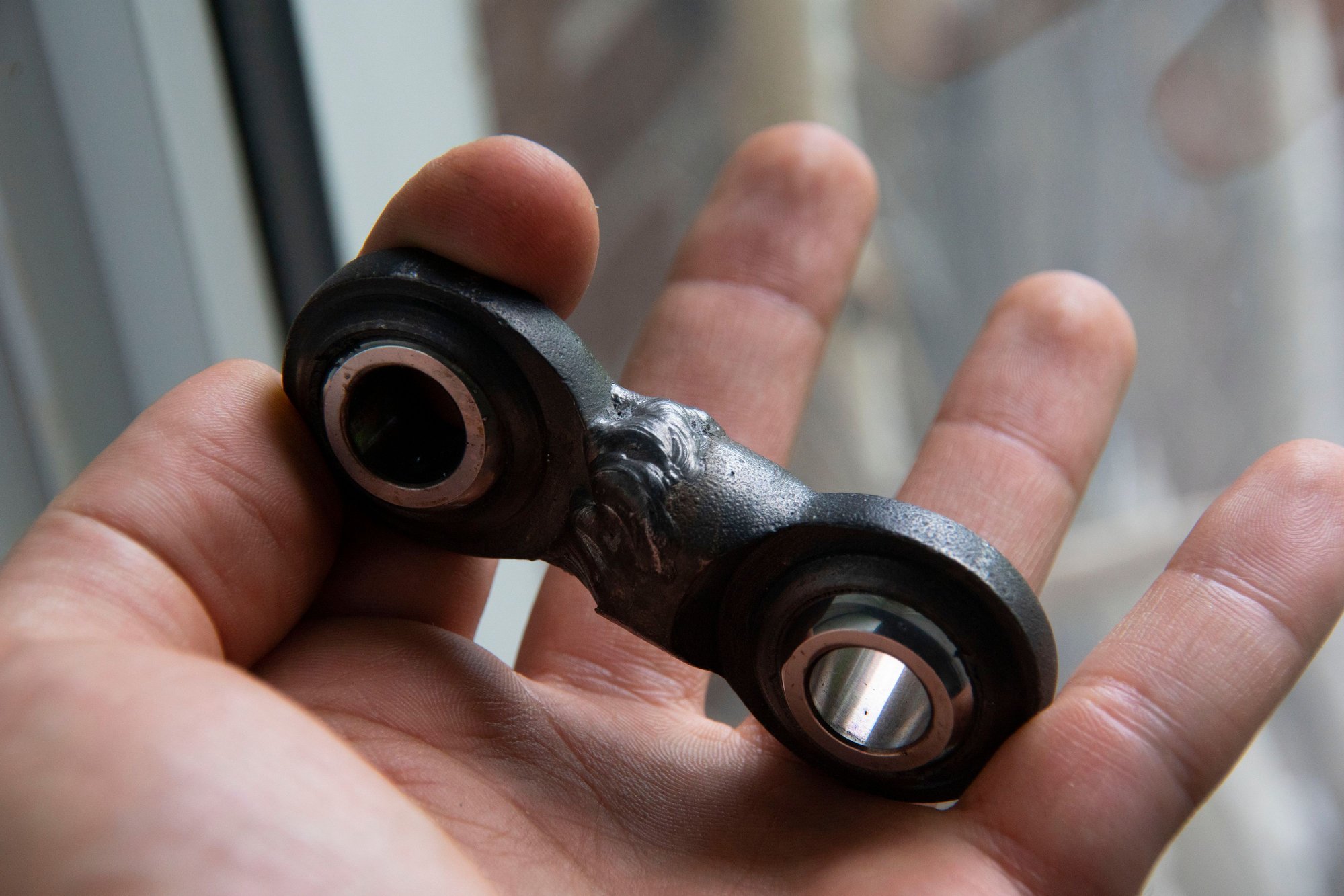 The plan with the new ones was to not even try to retain adjustability. I cut them down carefully until they matched the length of the old links (hole center to hole center) + 2mm. I had to leave the extra two mm to keep enough threads to feel comfortable, but with those extra 2mm it has about 5 threads engaged and it completely bottoms out. Then without installing the lock nut (it will never be adjustable again anyways) I completely welded the link all the way around.