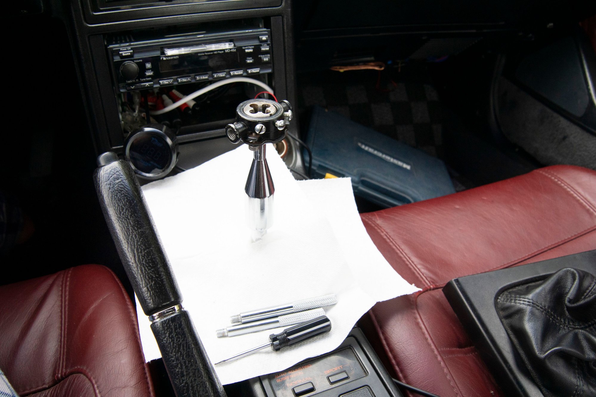 Then I went to put my shift **** on and, whoops, the threads are different. I looked into it and the Miata has a M10x1.25 shifter whereas the stock shifter is M12xsomething. I didn't want to buy a permanent shift-**** yet because I haven't decided on which style I wanted. I decided to go with something a bit more juvenile for a temporary solution (refer to post title):