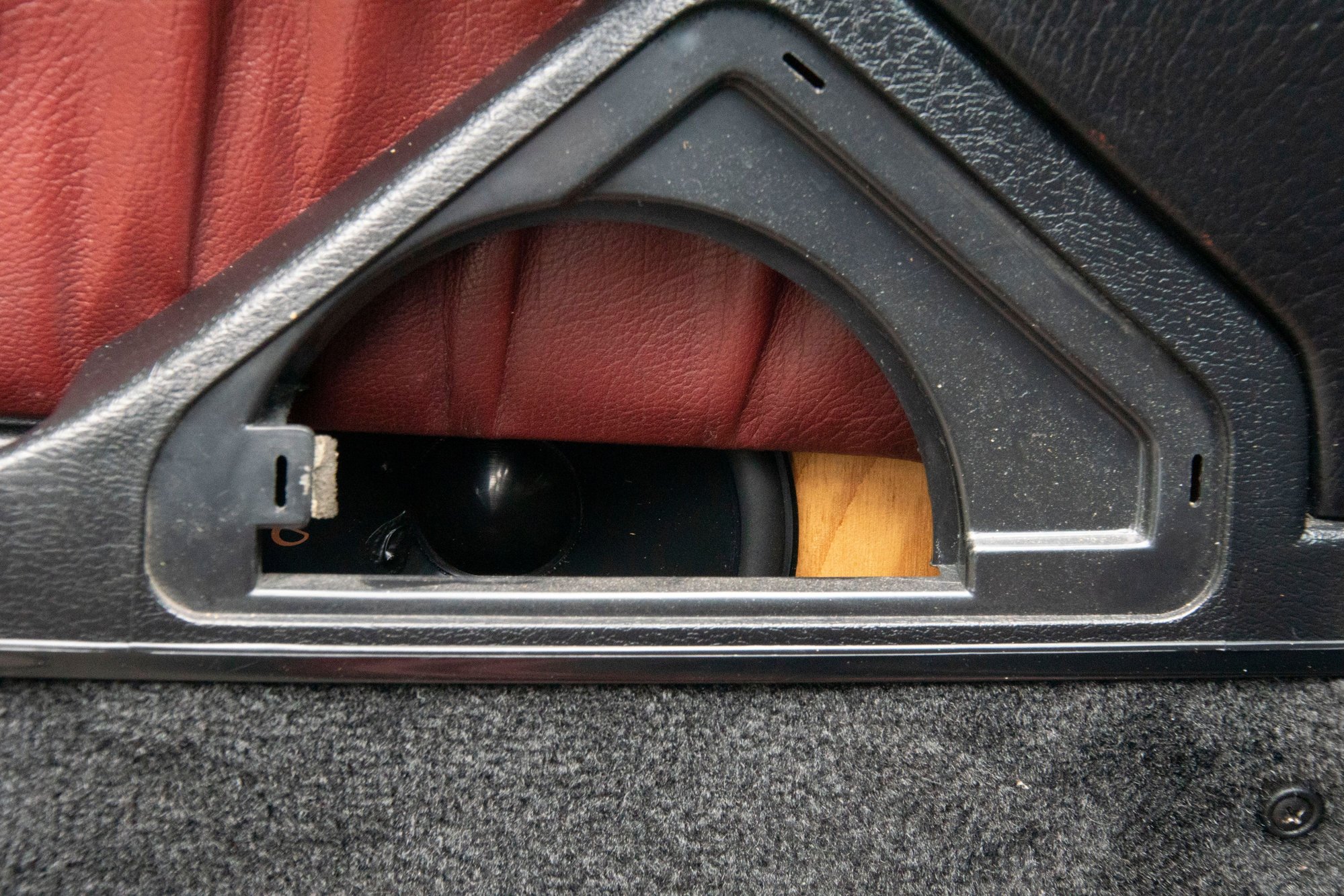 In this photo you can see two important things; the 5 1/4" speaker fits almost 100% within the opening (well, the half of the opening that Mazda exposed), and that the door card needs to be altered. Since I'm using an S4 part for the maroon leather insert, the map pocket was originally much wider and extended all the way along the bottom of the door.