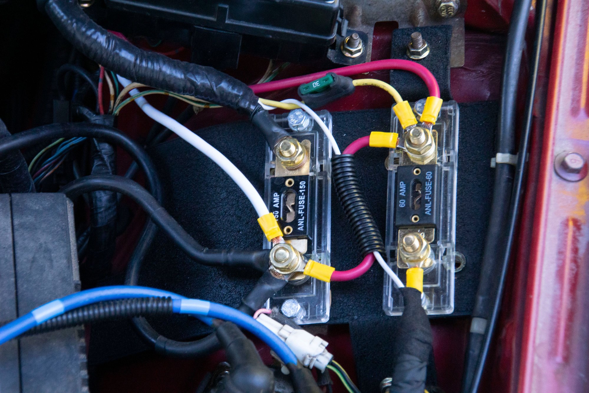 A distribution block is on the to-do list for this winter. There's nothing wrong with this electrically speaking but it gets messier and messier with each new wire (also did a fuel pump rewire awhile back). Going to have to neaten this up soon.
