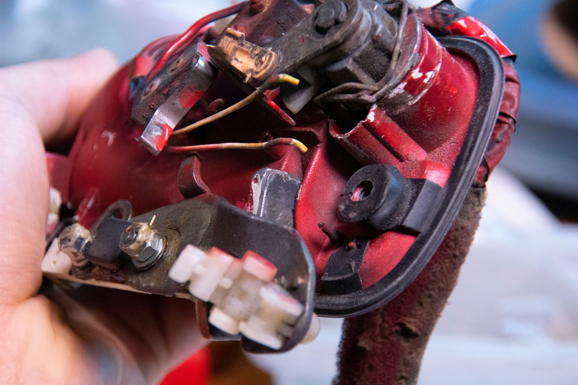 Here you can see two things; my original repair for the infamous cracked handle (with help from a piece of sheet steel and my old friend JB) and the missing bulb for the backlit keyhole. I guess I had that feature all along?