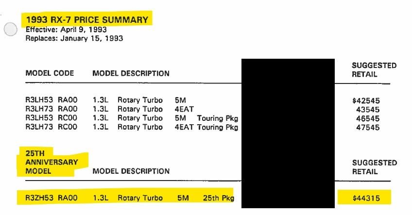 Just happened to meet a local FD owner tonight who has an actual 1993 25th anniversary edition. He mentioned that cruise control and deluxe carpets were also a feature of the Canadian 25th anniversary edition. He mentioned no rear wiper or front headlight washer. But the car also has the DRL set up found in Canadian cars. He will send me a pic of the VIN.