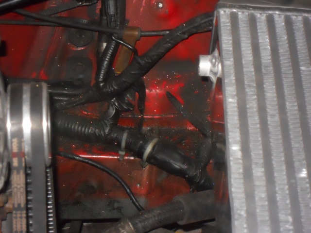 for casual john the intercooler would not fit in with the support in there because the inlet and outlet were exactly inline with the shock towers and with it being three inch pipe it would not fit the piping