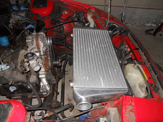 looks good the intercooler is off level about half an inch but that wont be noticable when i put the sheet metal on and it gives me just enough room for the rad and e fan