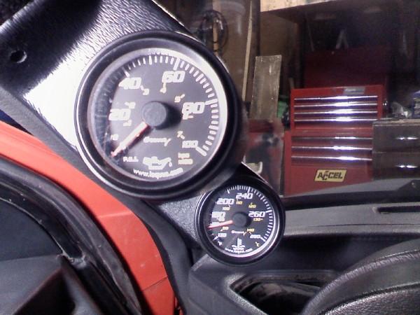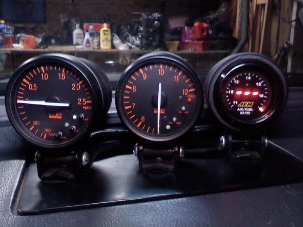 Here is my stuff. Made my own fiberglass panel for the 3 gauges on my dash. And relocated the warning lights to radio area. Gauges include Equs Oil Pressure and Water Temp. Old school HKS Boost and EGT, final the AEM Wideband AFR. Had to keep it as similar as I could with color. I also wanted to go for a older jdm cleaner styling and I like keepin the gauges in plain view.