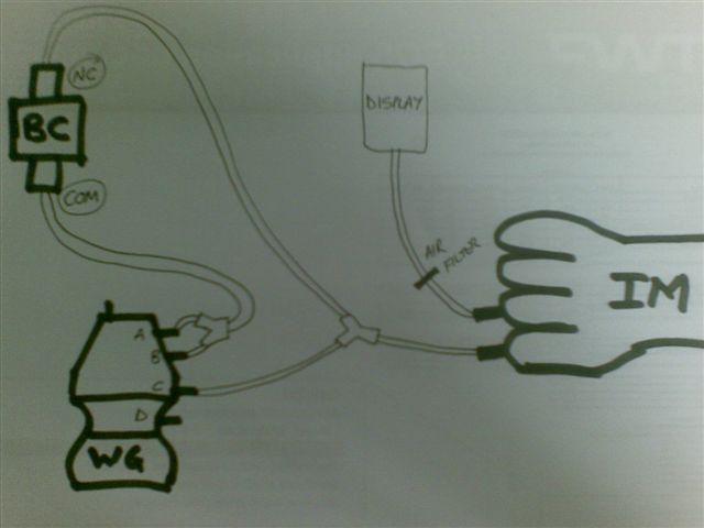 i played a little with the various settings for the vacuum & pressure lines to the wastegate and have found a setup that suits my fueling for now, the lowest setting i could get was just with port C&D tee'd into a pressure source, port A&B left open as well as the port ontop left open resulted in 7PSI . with A&C&D plumbed to a pressure source, boost is consistent at 9PSI and im happy with the that for now, would have like about 10 or 11PSI.