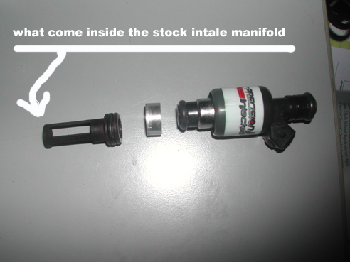 In the stock turbo II injector holes are plastic inserts that look like filters where the stock injectors sit in.” see picture below"