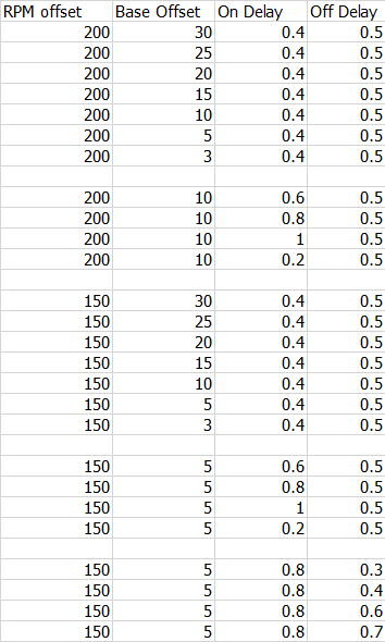 Do this in a methodical way, don't just randomly pick a bunch of numbers. You need to get the offset rpm and offset base % figured out. The delay is probably less important. See below example of what I'm talking about. You don't have to do every one of these combinations, but understand the method here. Don't go chasing your tail. This also assumes your idle AFR and spark are stable, and environmental conditions are stable as well.