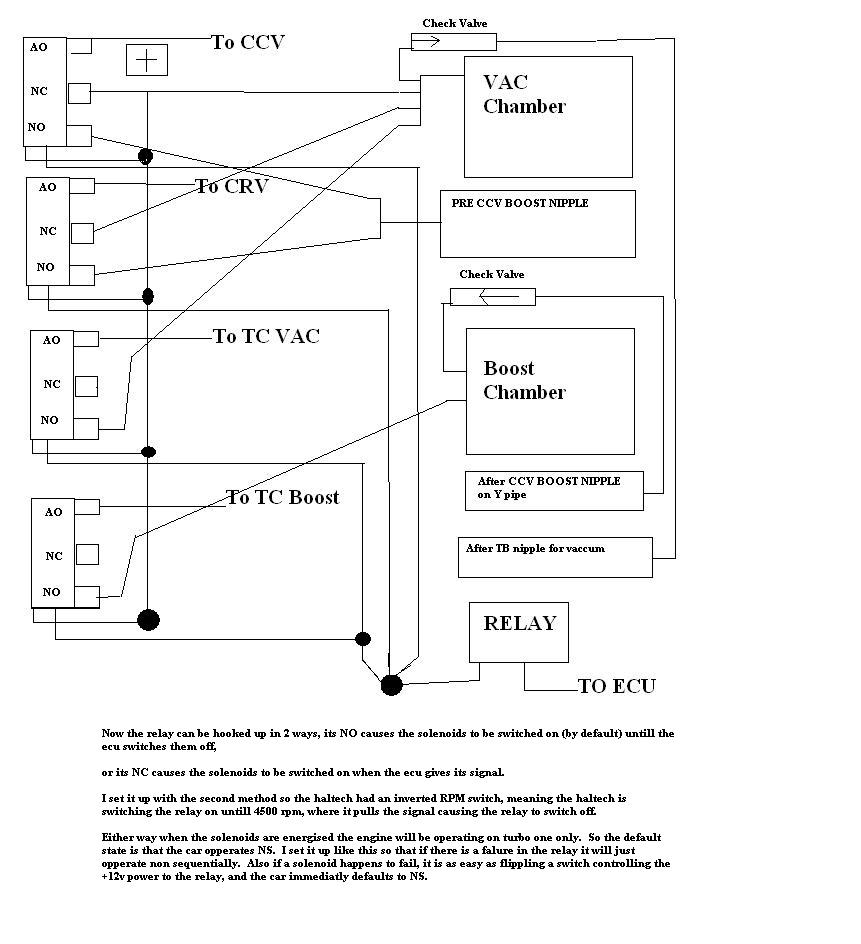 this is a really good thread. This proves that you can run the stock twins sequential with nothing more than 2 rpm switches 2 dual pole relays 4 vaccum solenoids and a boost controller.