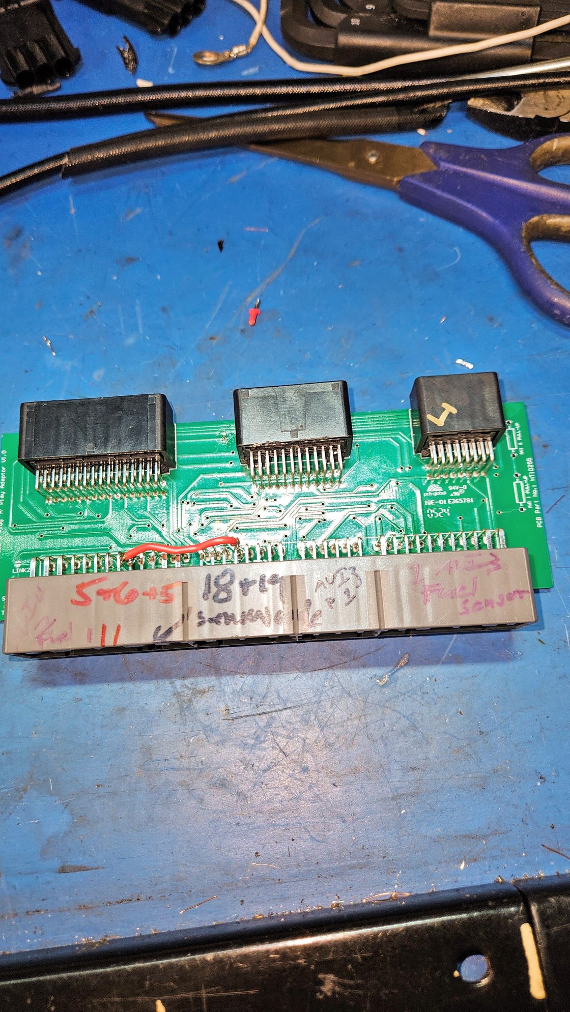 On the adaptor circuit board, pin #7 of the 26 pin connector on the engine harness side was jumpered to pin #1 of 16 pin connector, also on the engine harness side of the box.