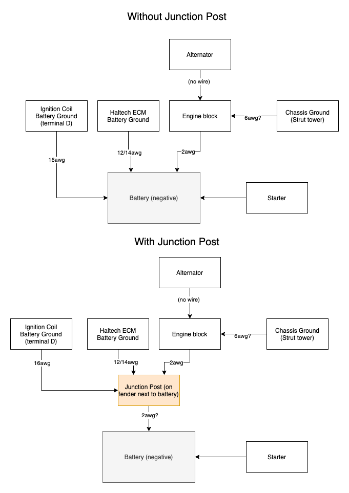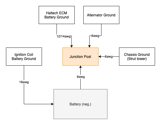 Also, with this setup I'll be running a lot of wires directly to the battery. Is it not OK to put a stud right next to the battery with a single large gauge wire connecting the stud to the negative terminal, or do all these wires (coils, haltech ground, engine ground strap, etc) need to go directly to the terminal?