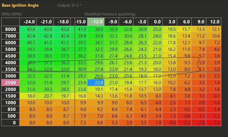 right now, i'm running the default PFC map, except the cell where the autotune corrected it. when it hit 900c, I was tuning it, so had pulled a couple/few degrees so maybe like 16btdc? going from 11.5 to like 11.3 fixed it, the stock map is like 19