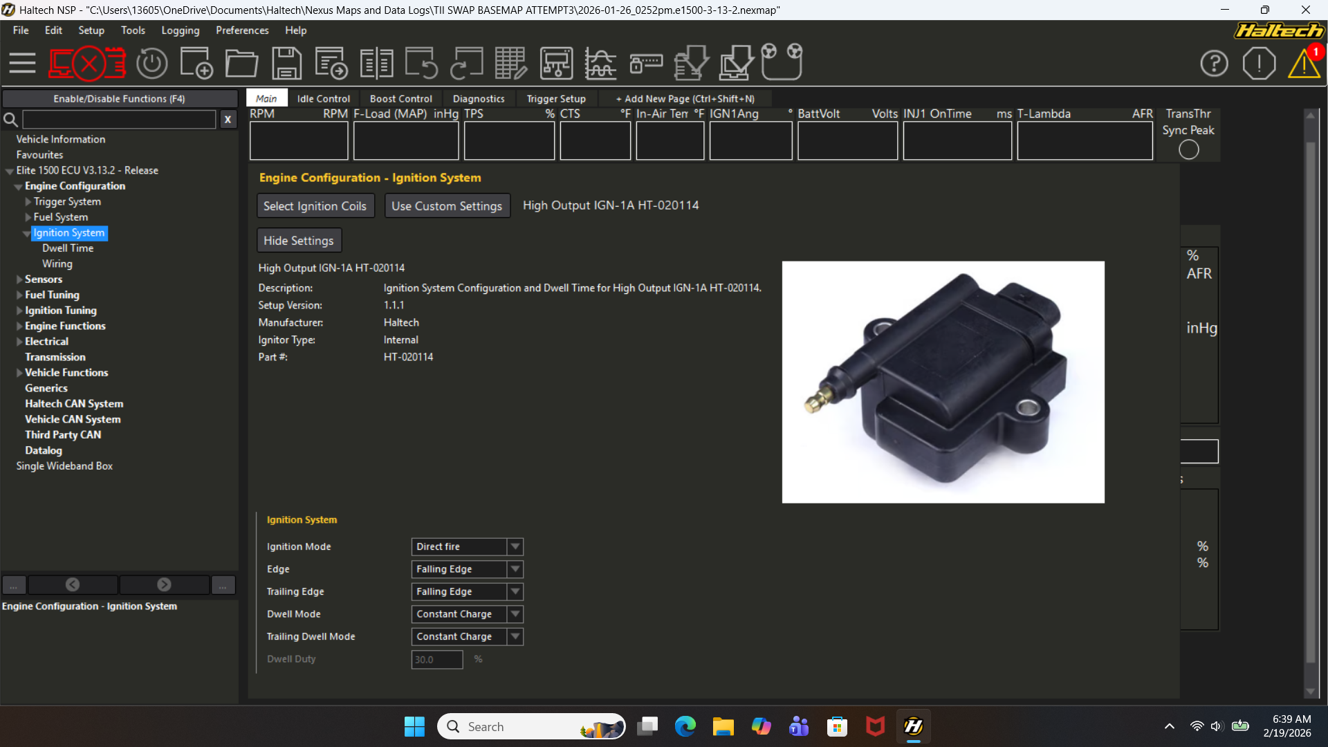Hey guys, hoping for some ideas. I have a 1982 rx7 that I swapped an s4 TII motor into, ive got an elite 1500, haltech s4/s5 13b terminated harness for ign1a's, haltech ign1a, stock CAS. Trying to use haltech provided basemap (I tried to attach mine but it would not let me), I selected the cas under "select trigger system" and the haltech ign1a coils under "select coils". The ECU is reading RPM and only has two errors because I pulled fuse to stop fuel. Under engine configuration> ignition system> wiring, I can see that all of my coils are outputting at 4hz and 2.6% duty cycle when cranking.