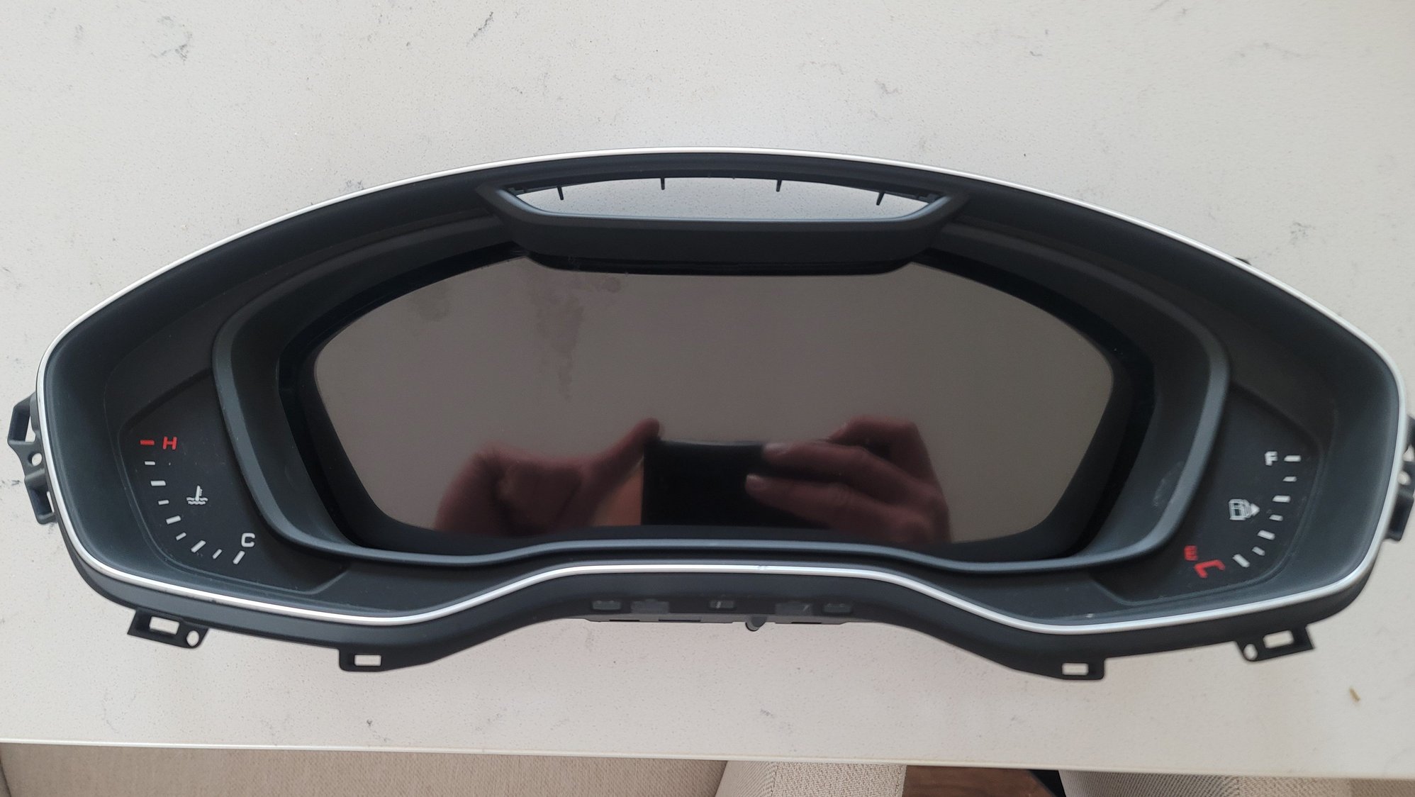 I've seen some of the Audi Virtual Cockpit clusters and with the curvature at the top, they seem like they would match pretty well with the stock gauge hood. I found whole clusters on eBay, but I've also found just the screen itself, and the measurement looks like it might just work. It covers basically the entire area where the original gauge holes are, almost perfectly to the far edges of the fuel level and speedo, and up just past the blinkers, but the top corners are angled so it would clear the curvature of the hood. OneGauge said they'd hacked OEM clusters before and that I could buy one and send it to them to try out.