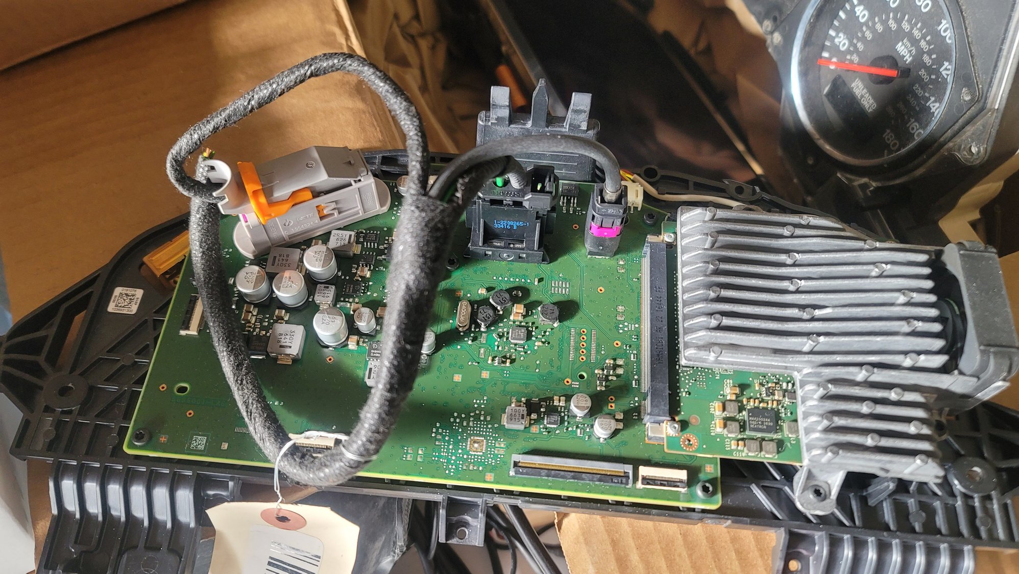 The white ribbons are for the fuel level, coolant temp, and idiot lights, so I won't need those. But I will need to figure out what I need to tap into one or both of the other ribbons. I'm not sure if I'll need both of them or just one. I'm planning on checking with a multimeter to see where they go in the connector and hopefully find a wiring diagram for this car. Or if someone knows how to hack OEM clusters so I could use the whole thing, that would work too haha. Actually, that won't work because I don't plan on using the 'analog' gauges and I'll need those things to run to the screen. Anyway, the larger ribbon has 64 and the smaller has 13. If anyone knows how to identify these, what they're called, that would be great. It's difficult to research this stuff when I don't know the exact terminology. Or maybe if someone can identify what each board does, that would help too.