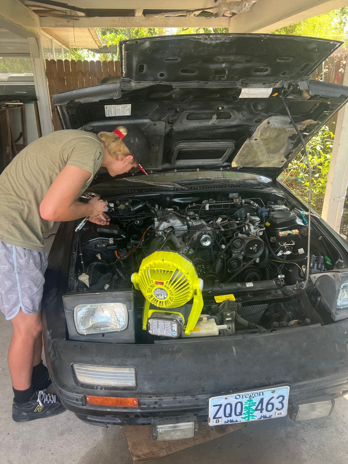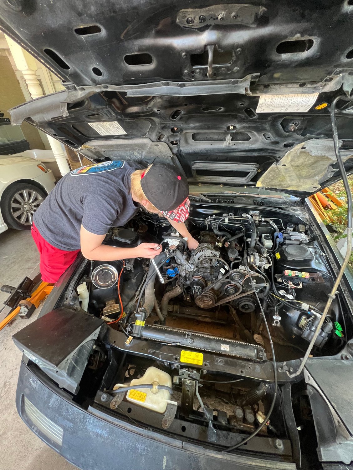Within the first 2 days of the car sitting in the driveway he dove into it and started tearing out all the emissions. Maybe a little too ambitions but we've been able to put everything back together. We ended up cooking ECU by hooking up the battery incorrectly. New ECU, fuel pump and a bit of rewiring and we've been able to get the car started after sitting for 20+ years!! Though it took some ATF and learning how to 'unflood' the fuel system and quite a bit of smoke she runs better than I thought she would.