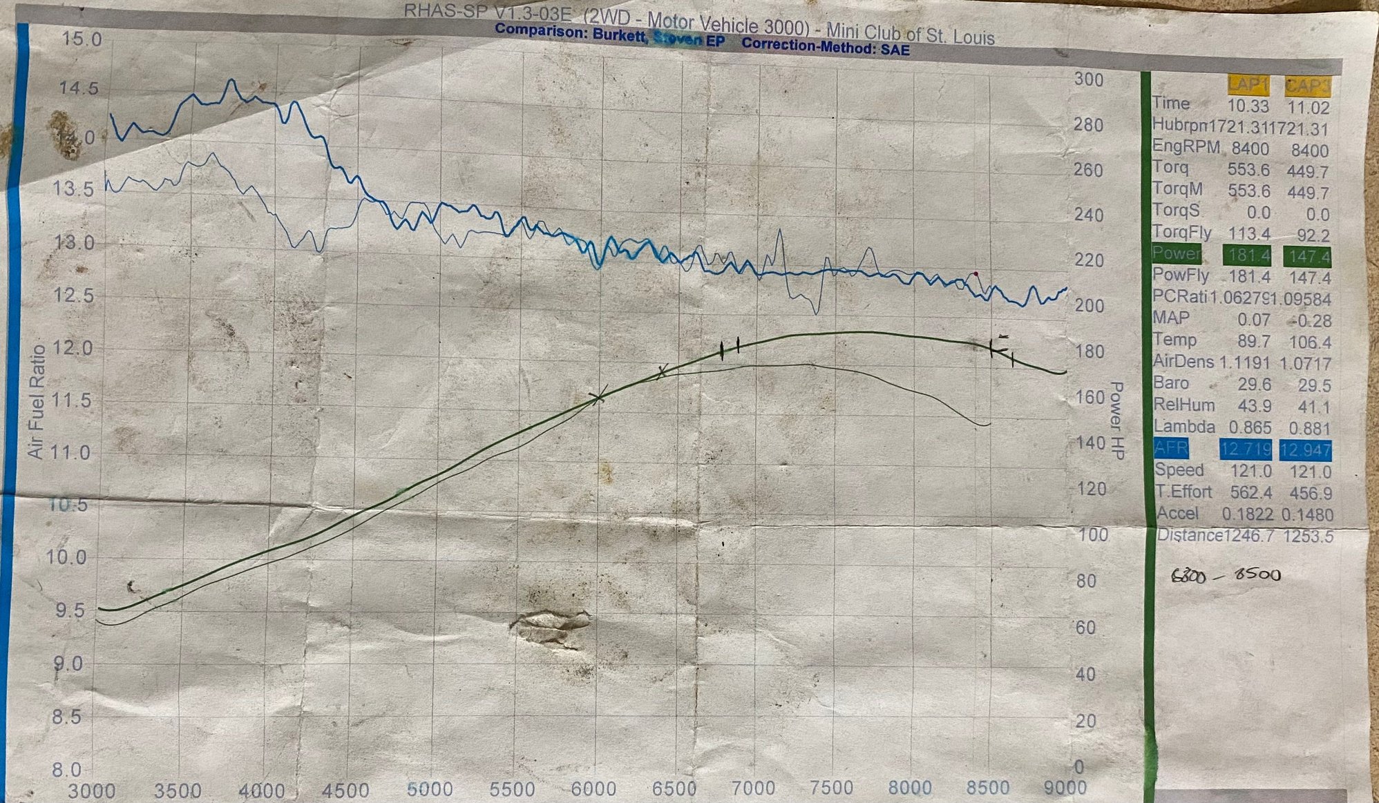 For any potential buyers, I thought this would shed some light on the reliability and quality of this engine. Here is the dyno sheet from when the car/engine was built, keep in mind this is wheel horsepower. Another reminder, I did not build the car. The guy who built it ran a rotary shop in St. Louis for over 20 years and raced these cars for a long time. He knows these cars inside and out, & this is a perfect example of a car that was built to spend all day at the track and not let you down.