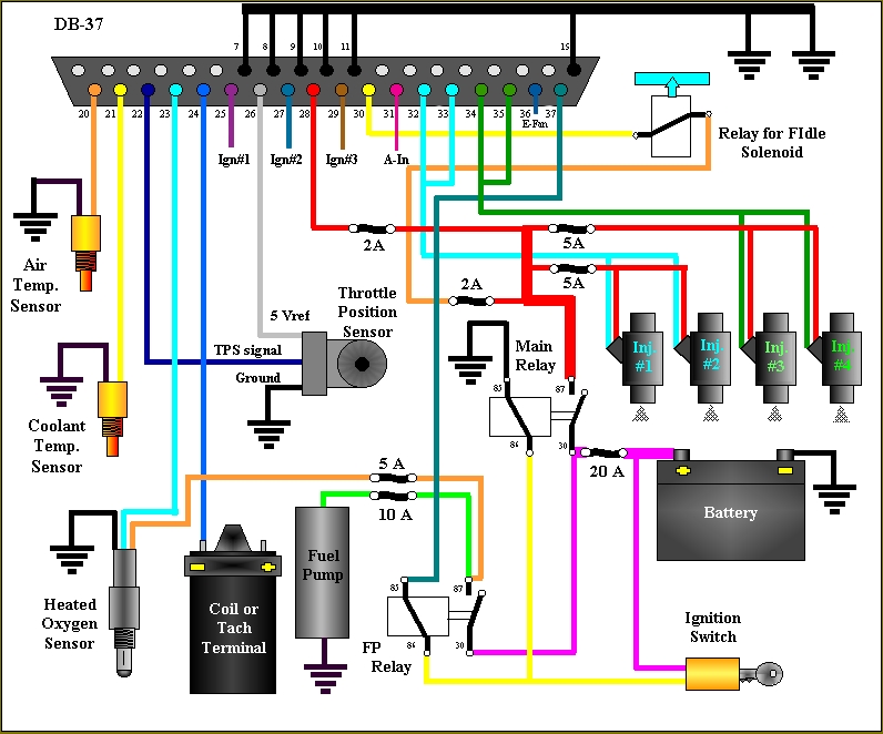 Here's a modified schematic I put together a while back. If you use a modified CAS (knock 2 opposing teeth off the 24-tooth wheel), then all signals can be fed nicely through the DB37, rather than requiring extra wires/connectors. Ign #1 thru #3 are the three ignition outputs to leading, trailing, and select wires on the FC ignitors. A-In is a spare analog input for datalogging fuel pressure, compressor discharge temp, or whatever. E-Fan is the electric fan output. The tach signal on pin 24 shows connection to the coil -ve terminal, but would actually be the +ve VR sensor lead from the 24-2 VR sensor in the CAS. The -ve VR sensor lead is terminated to ground at the upper row of DB37 pins.