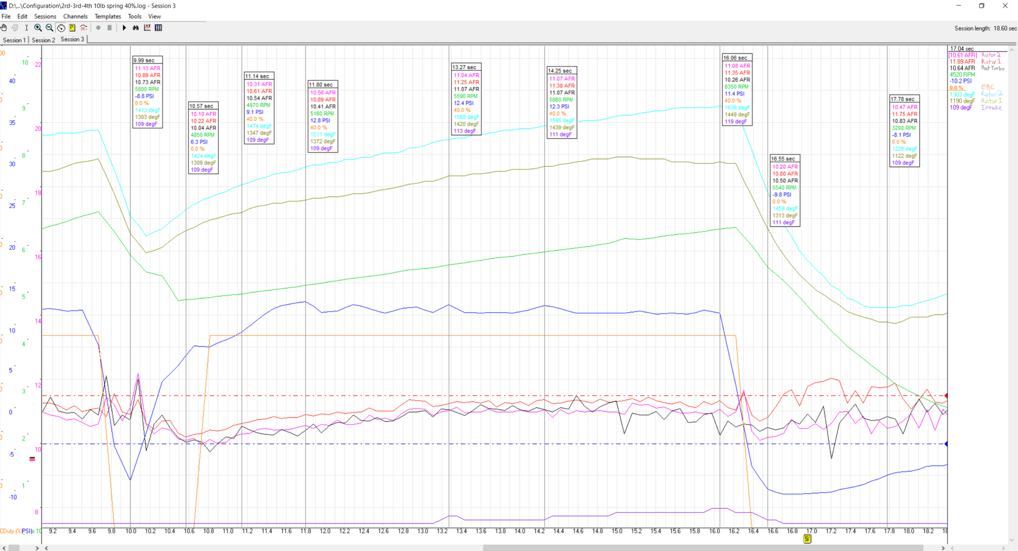 This run was at 16psi for final "testing" purposes.^ Once on the street it made a tad more boost (duh) 18psi (Log below) . Comp. tested it as soon as getting back and the rear rotor was down 10-12psi on all faces, front unaffected. Cruised with no boost for 200 miles and it came back into the mid 80's.