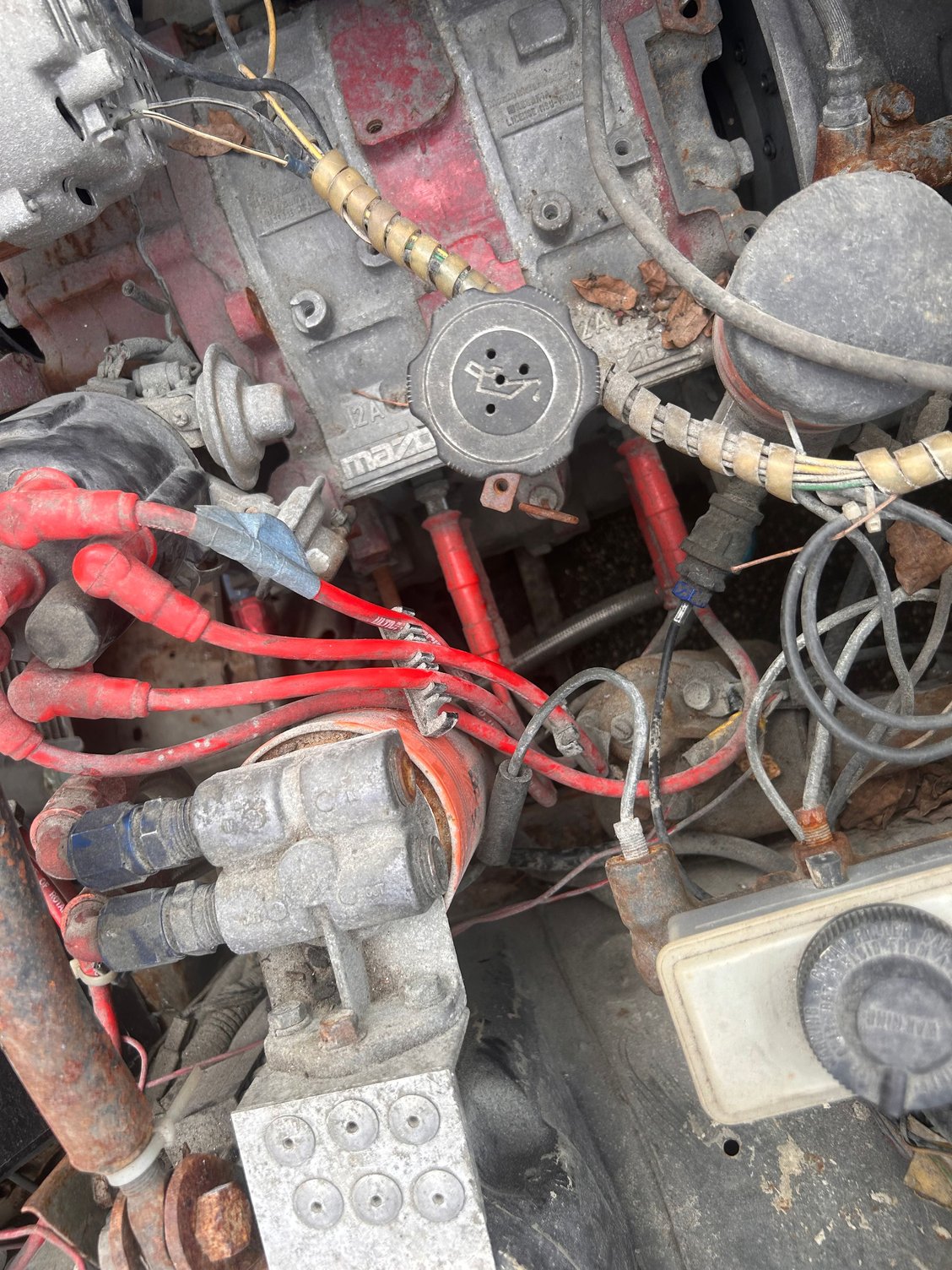 So I’ve been up for the past week looking at videos on restoring 12a’s and really what a rotary engine is, but most things are gone or changed so I’m really not sure how much this thing is missing if anything. The first thing I noticed was holes on the top of the engine where the original brought tubes with plugs that had different colors, I don’t recall the name rn, but that’s not there, there an oil filter connected to a 4 way hose connector that says lead and trail but it’s missing two hoses so I’m not sure where that leads too. I can also see the engine was dismounted and painted red and silver so I’m led to believe that it might be bridgeported in some way. I also Researched and saw that the car model came with either a 4 or 5 speed manual so is there any way to check which one without turning on car, I can’t really change gears apart from neutral with the shift gnob.Another thing I saw is the Aluminum Radiator they have and just wanted to verify that flushing and cleaning it well would be fine to keep using it. Wiring doesn’t seem too bad, ignition boxes honestly look brand new, I have not a single clue as to how to work the race switches and I wouldn’t want to mess something up while trying to start the car as well as running it.
