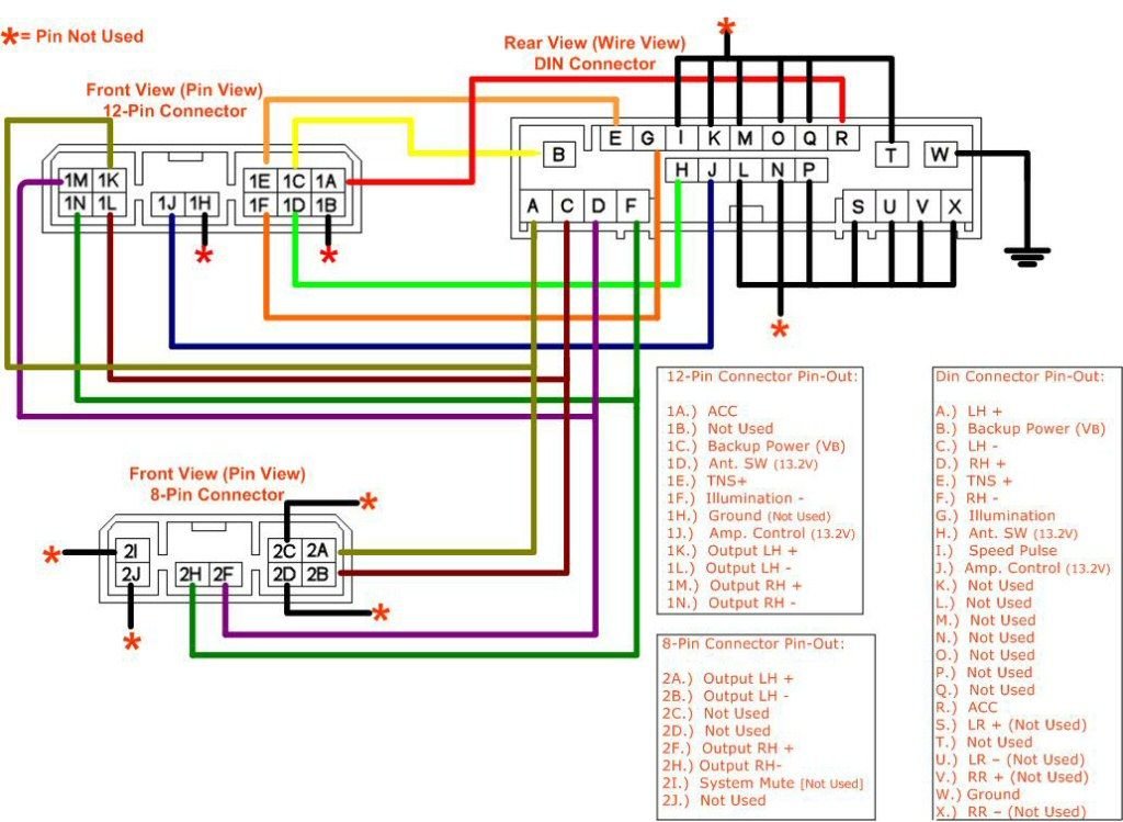 Looks like you hooked up positive 12v to pin 1 on back of stock Bose head unit and negative to battery ground. Then ran + and - speaker wire from the + and - pins for the left and right speakers off of the 8 pin connector. Did you connect the left and right speaker wire on the input of your aftermarket Clarion to Bose Stereo? Sounds pretty good.
